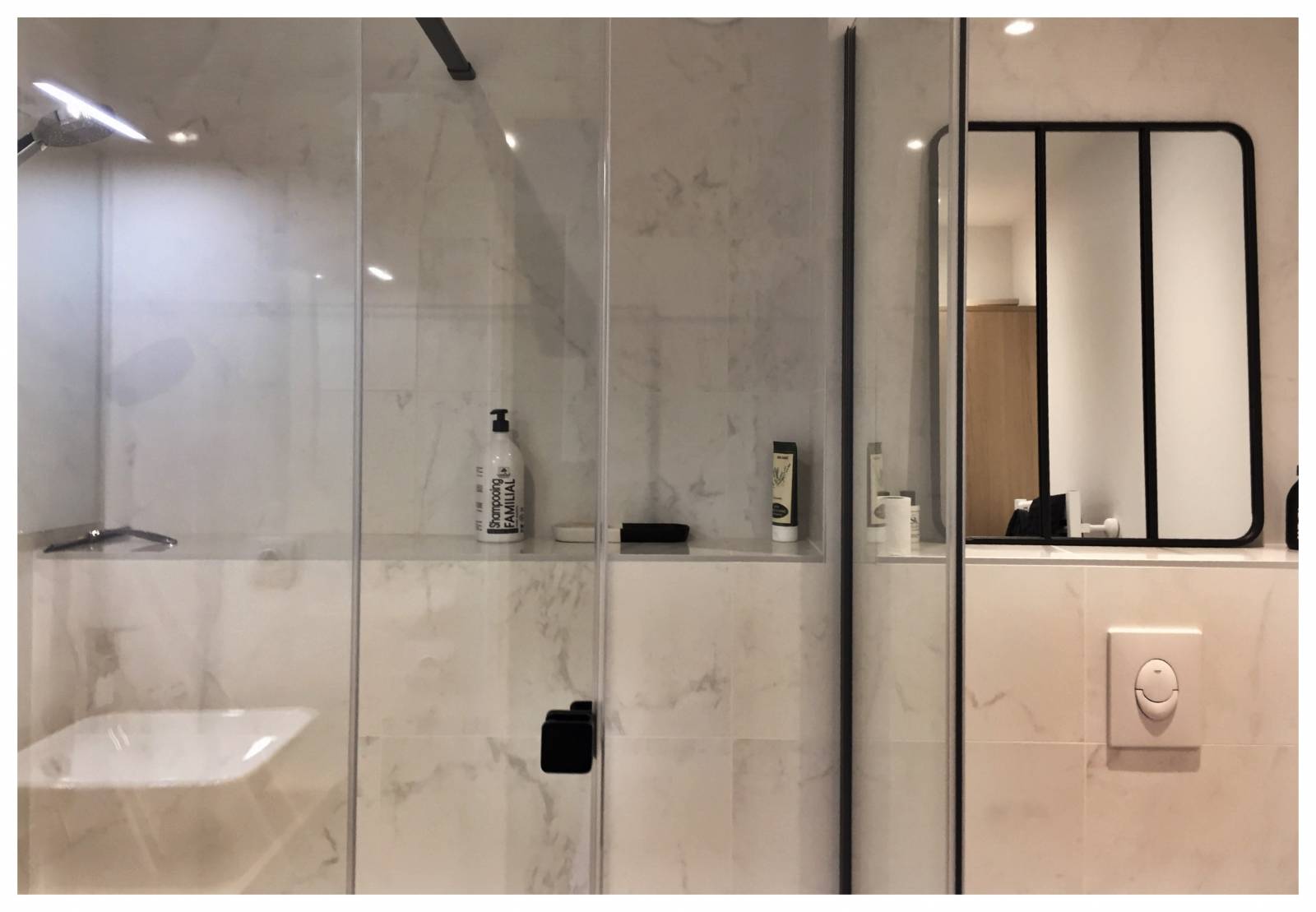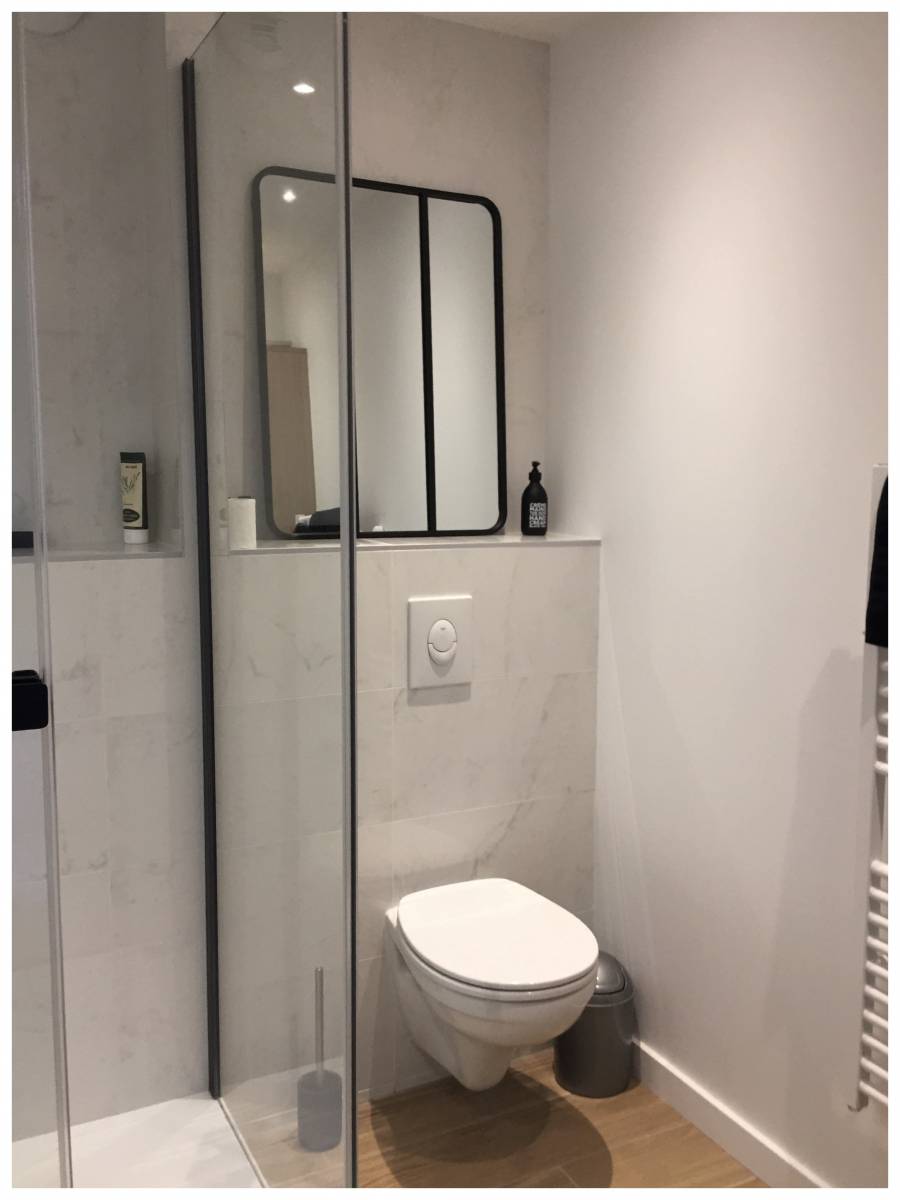 La salle de bain, laissée inachevée, se voit revêtue d'une toute nouvelle identité. La réflexion mène à l'ajout d'une douche, une nécessité pour cet appartement spacieux de 90 m². Le mariage de nuances de blanc et de bois se dessine, agrémenté par les délicates lignes du marbre. L'ensemble s'anime avec des touches de robinetterie et d'accessoires noirs, ajoutant une élégance saisissante.