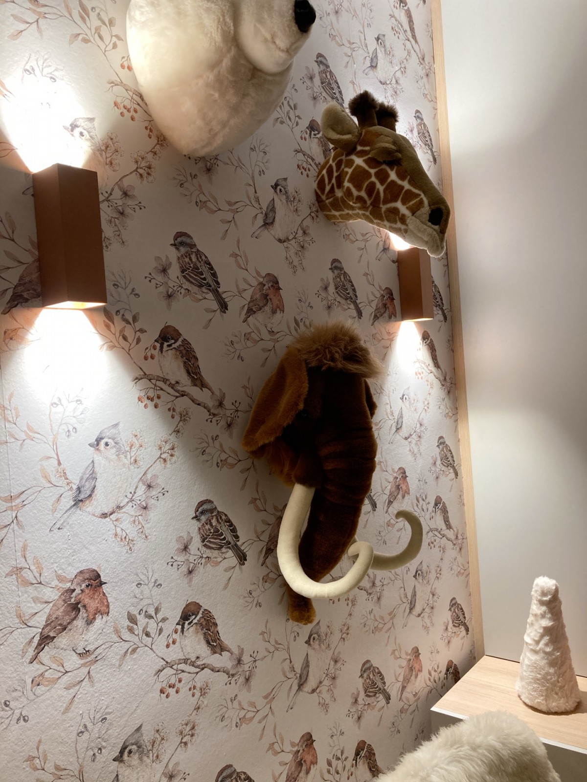 Les trophées accrochés au mur renforcent le côté animal de la chambre en étant toujours traité avec beaucoup de douceur.