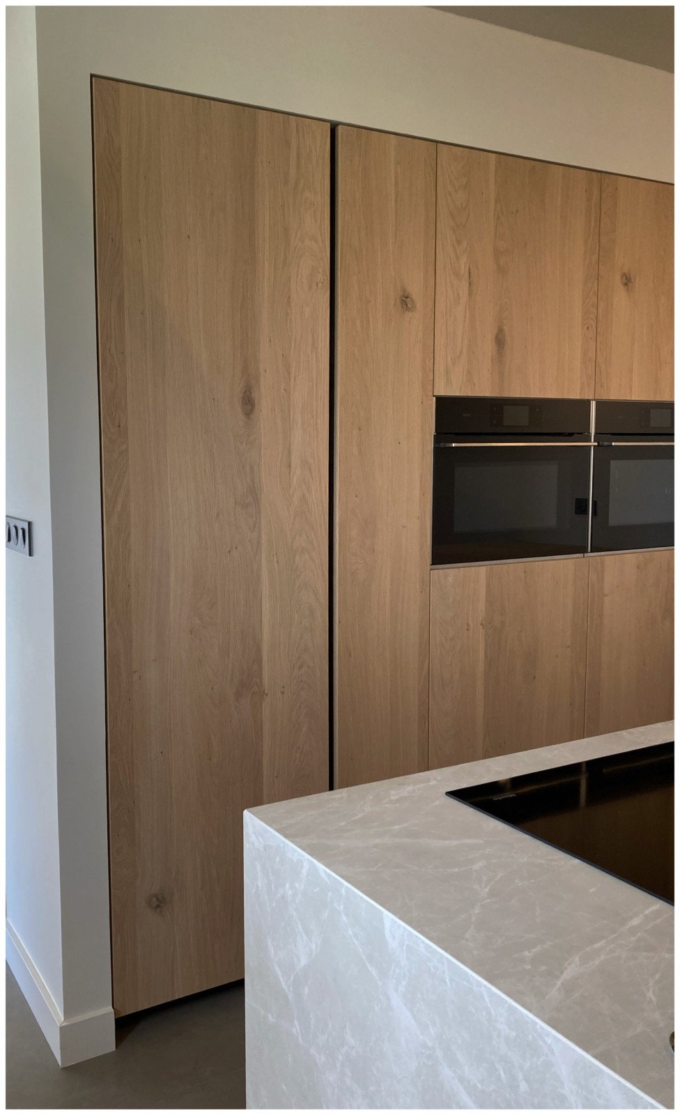 La cuisine a été réalisée en placage chêne et avec un plan de travail en céramique: fonctionnelle et esthétique , elle s'harmonise parfaitement aux proportions de la pièce.