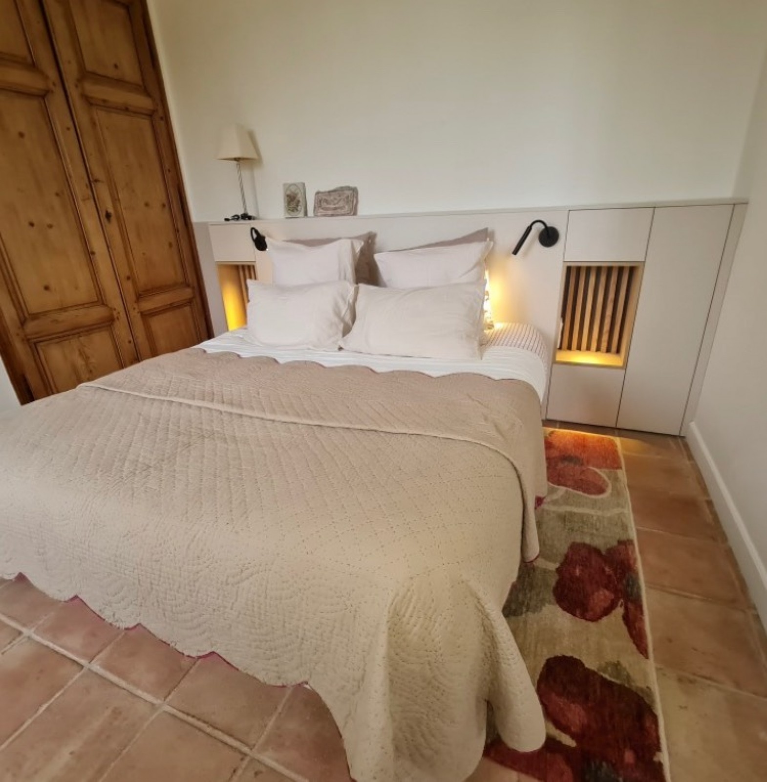 La tête de lit est très fonctionnelle avec des lumières et liseuses , les rangements restent discrets et alourdissent pas l’ensemble du volume .