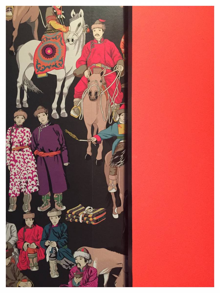 Le tapis en forme de peu de zèbre amène un rythme très intéressant graphique, noir et blanc à l'ensemble. Nous avons dessiné sur mesure avec Designheure cette magnifique suspension au dessus de la table de la salle à manger : des touches de doré qui rappellent les poignées en laiton de la cuisine.
