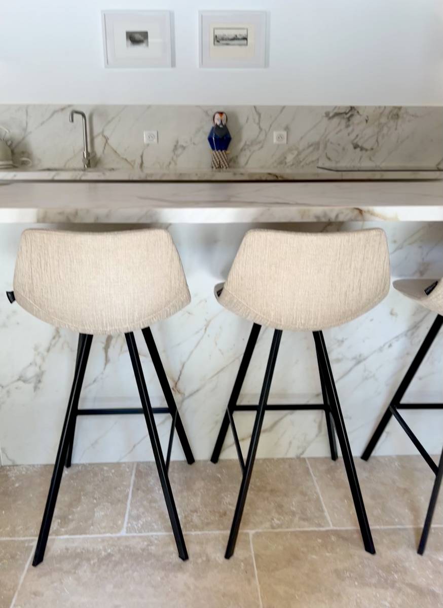 Nous avons dessiné 3 tabourets aux lignes fines et pures afin de ne pas alourdir les volumes de la nouvelle cuisine .