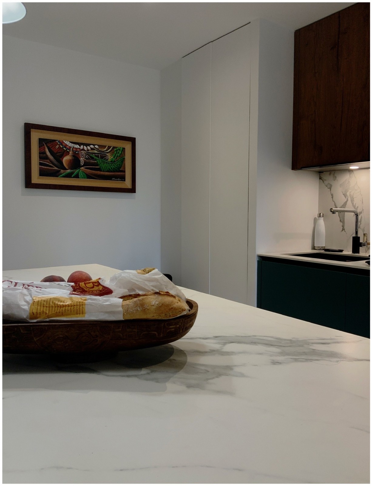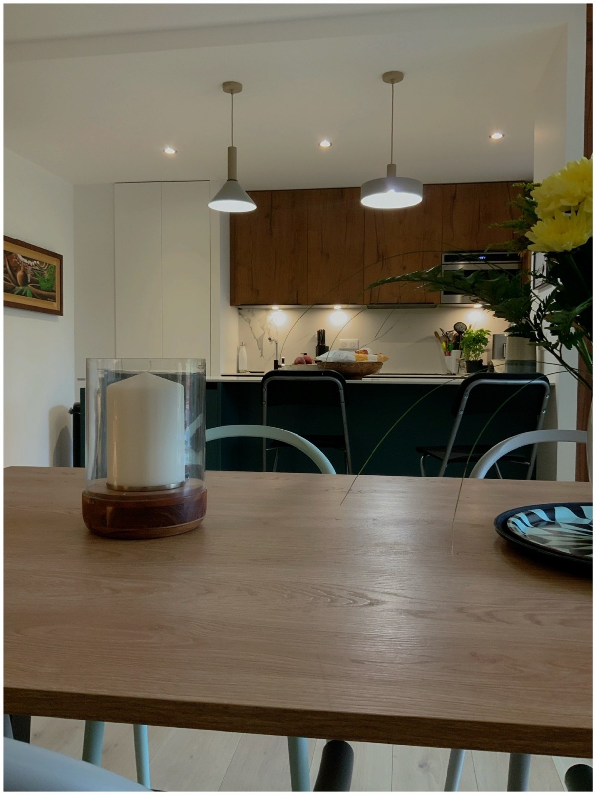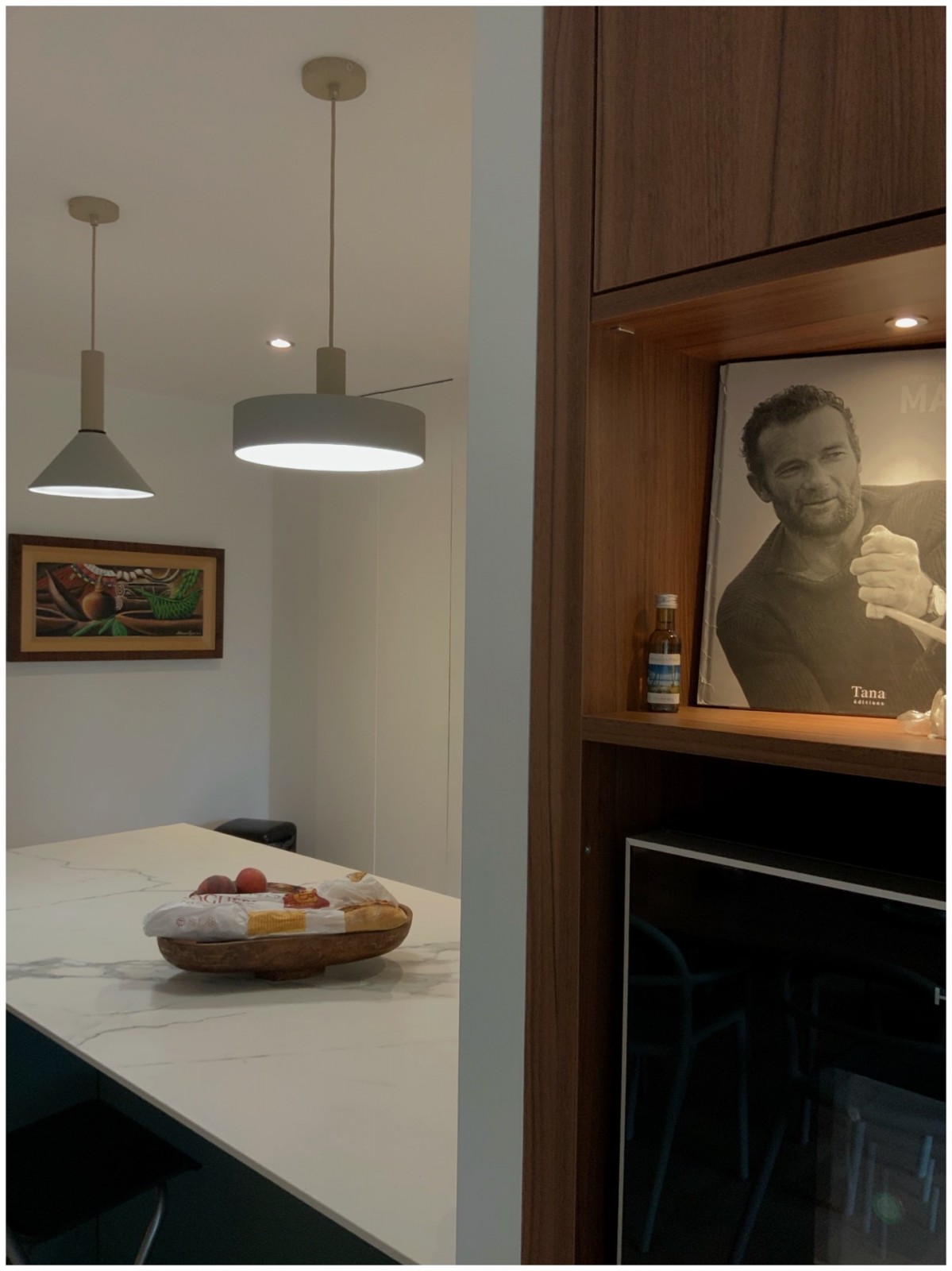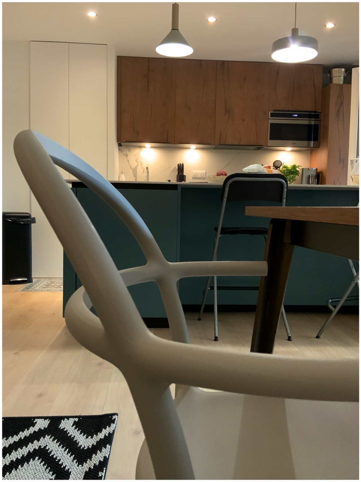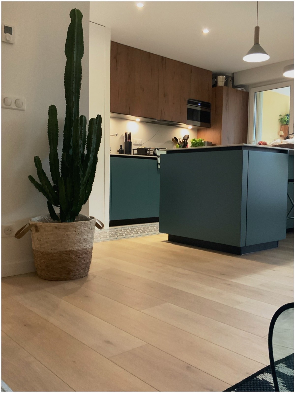 Les clients souhaitaient ouvrir le volume de leur cuisine afin de pouvoir profiter de l’espace et de la lumière naturelle. Nous avons donc décidé de travailler avec une couleur froide réchauffée par des portes en noyer . Le plan de travail a été réalisé en céramique , les clients souhaitaient retrouver l’ensemble des formes et des couleurs à l’intérieur de leur appartement. Grâce au travail confectionné sur mesure , l’agence offre aux clients un travail très qualitatif s’adaptant aux volumes existants et dessinés par l’agence : les matières, les essences de bois ainsi que les formes deviennent le fil conducteur de la création globale.