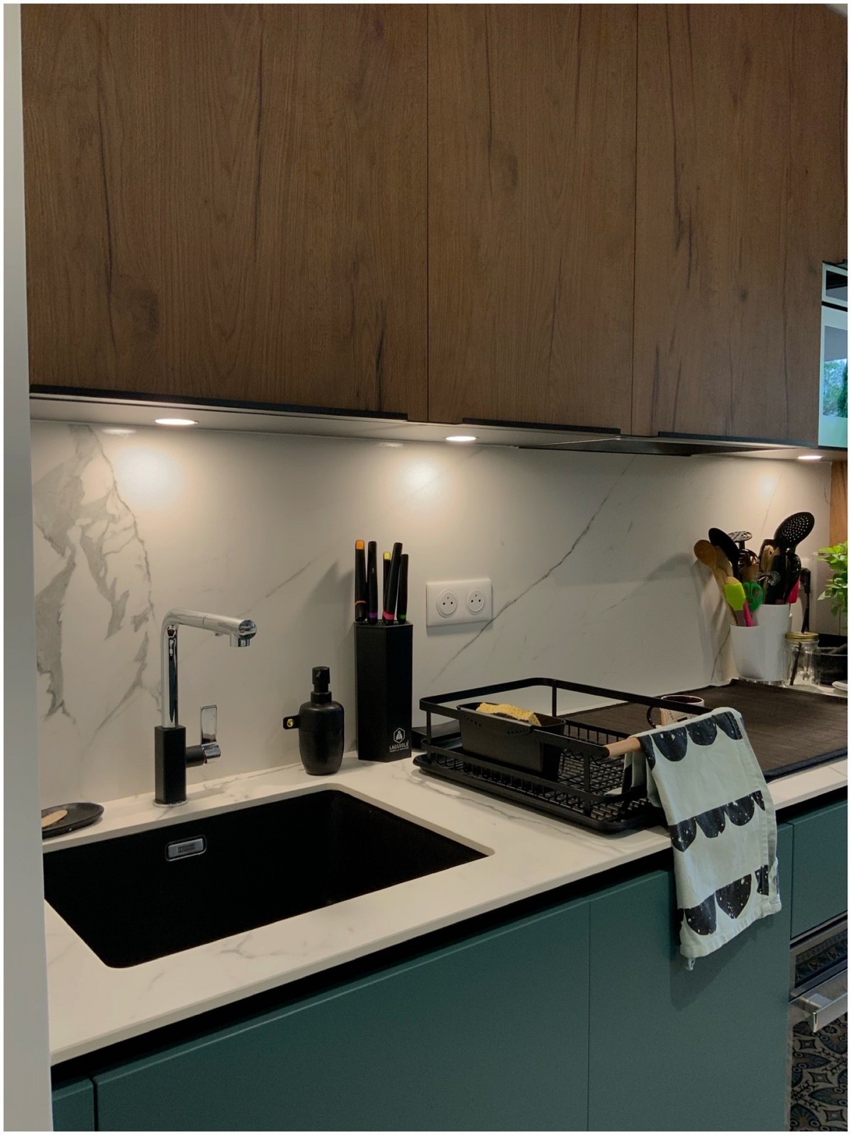 une cuisine en céramique : mélange de couleur et de noyer |