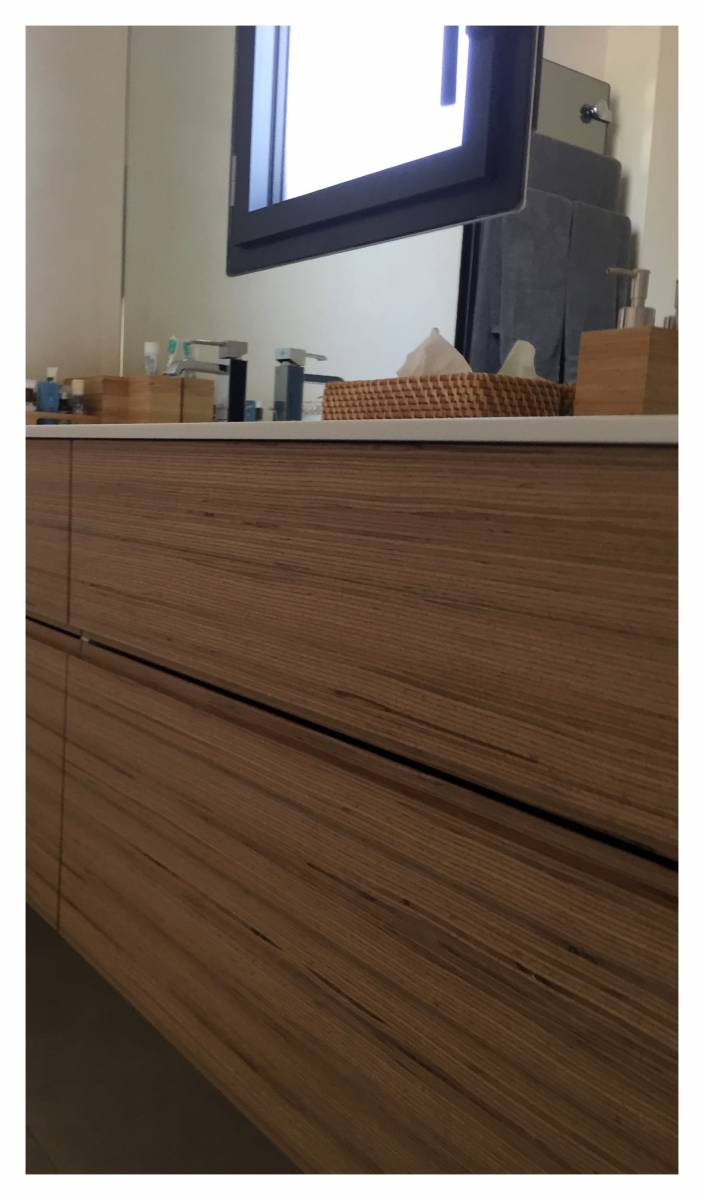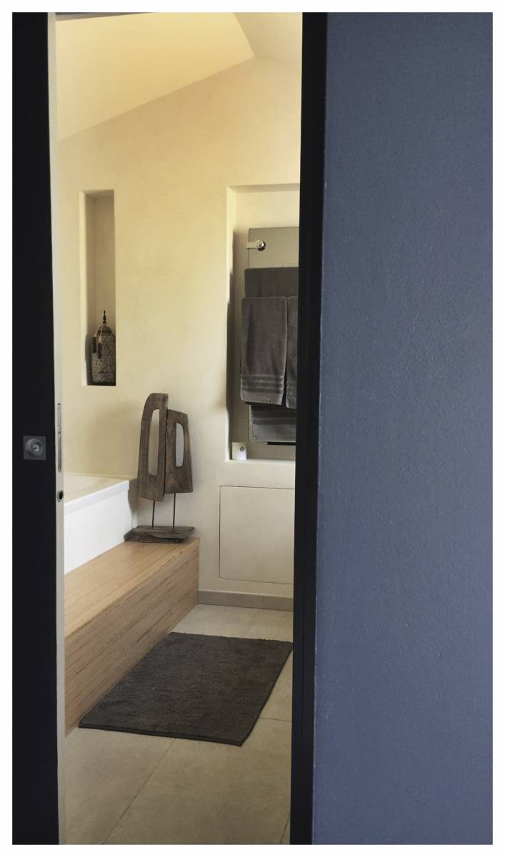 Grâce à ces petites astuces , nous avons transformé cette contrainte en point fort de cette salle de bain. La cliente n’a aucune rupture visuelle et profite pleinement de sa salle de bain pour se détendre.
