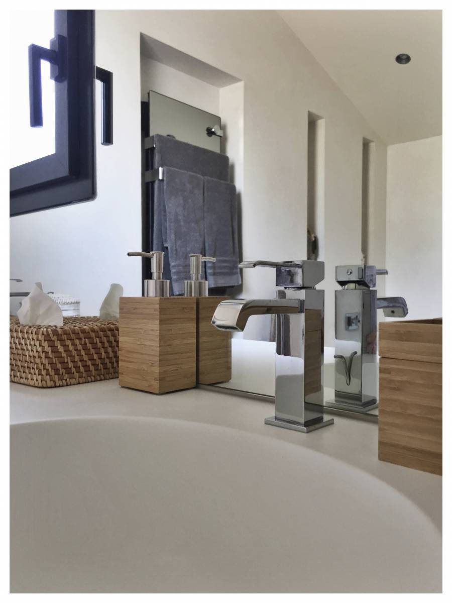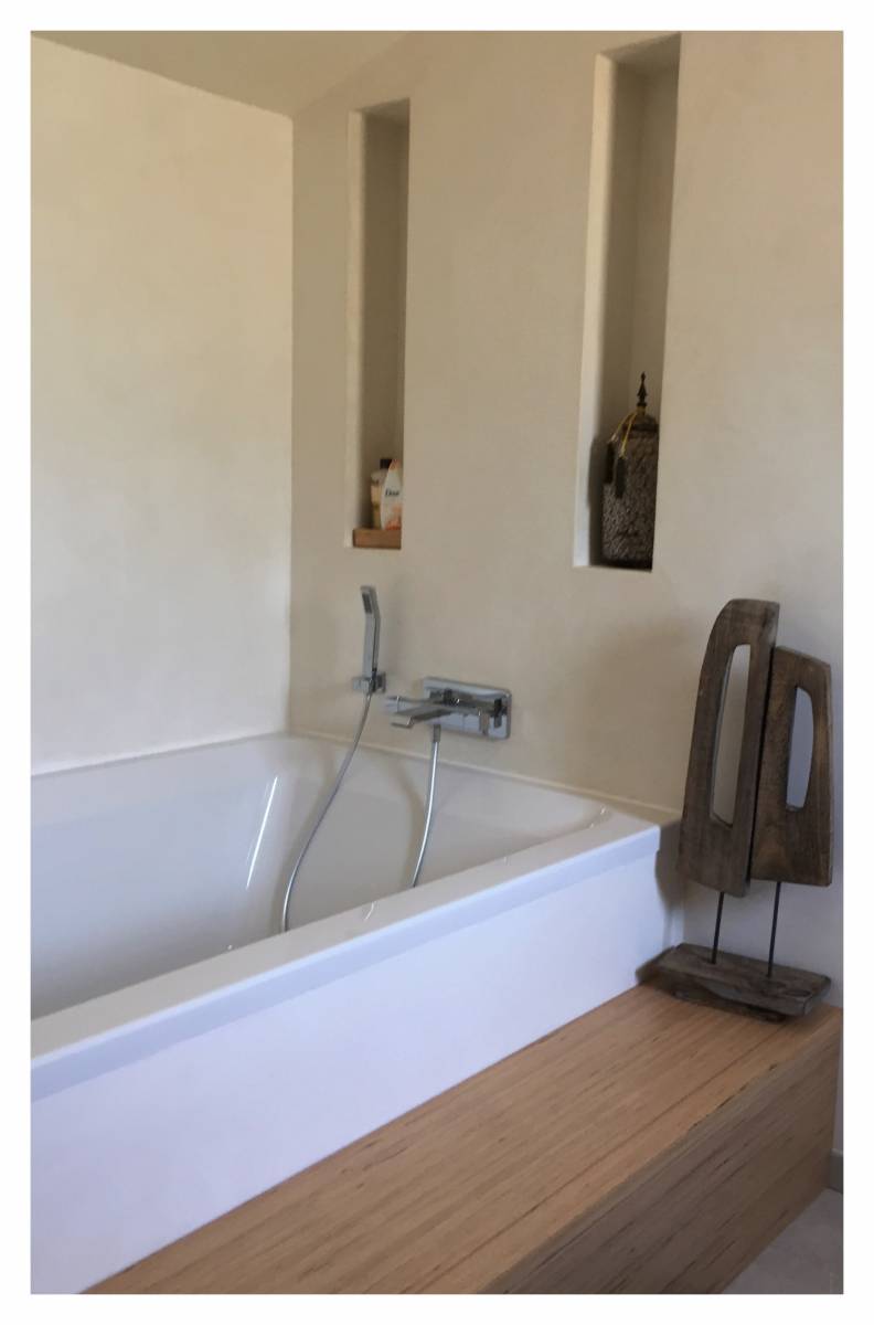 Cette création de salle de bain avec baignoire jacuzzi a permis d'apporter à notre cliente un espace dédié à la quiétude, à la sérénité caractérisé par un bois clair rythmé par des lignes fines , du bambou , de la pierre claire et du tadelakt.
