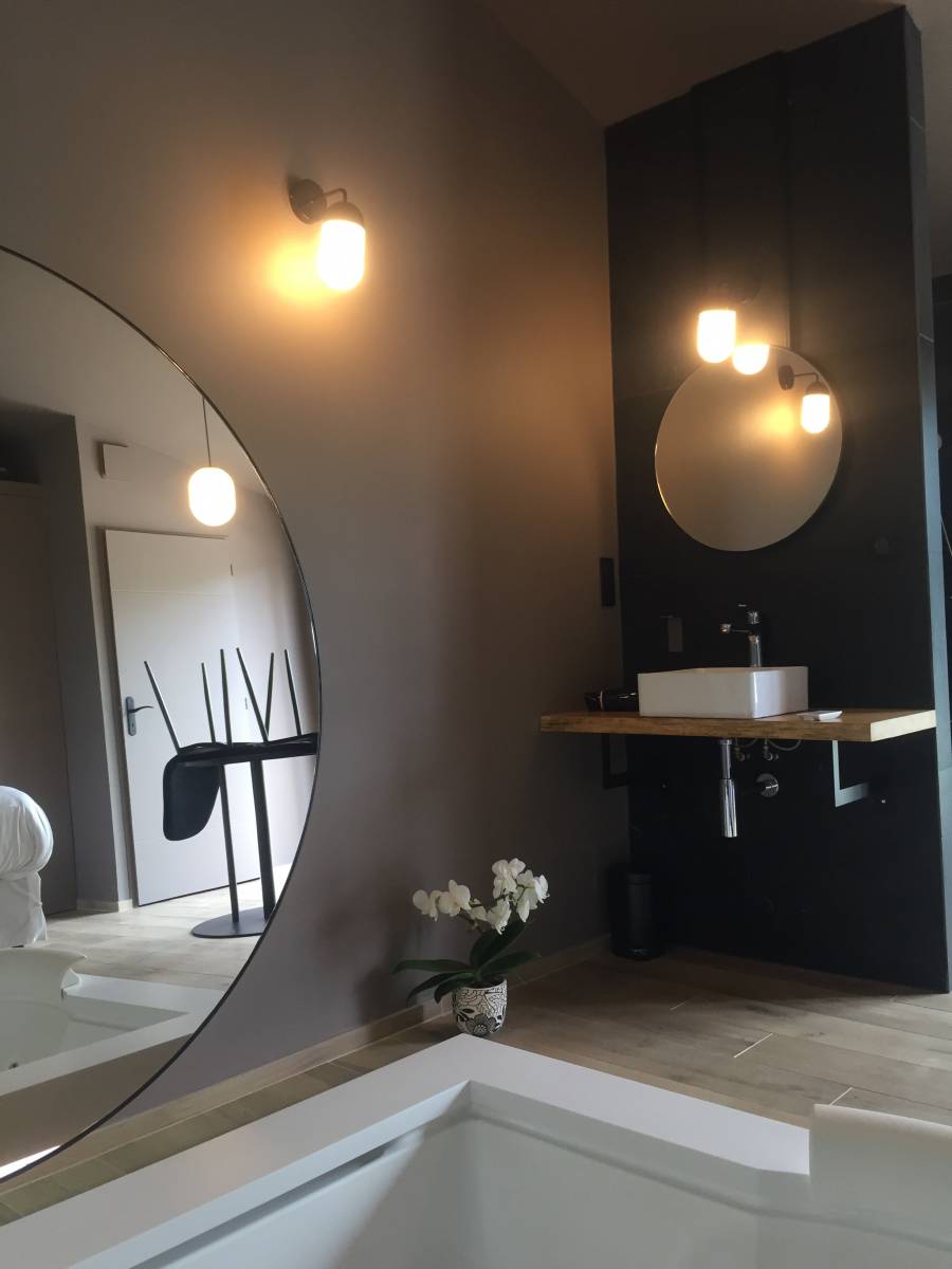 Les très grands miroirs ronds apportent de la douceur et permettent de travailler sur un jeu de perspective très intéressants .Une rondeur remarquable par les proportions de la taille des miroirs dessinés sur mesure pour les besoins du projet.
