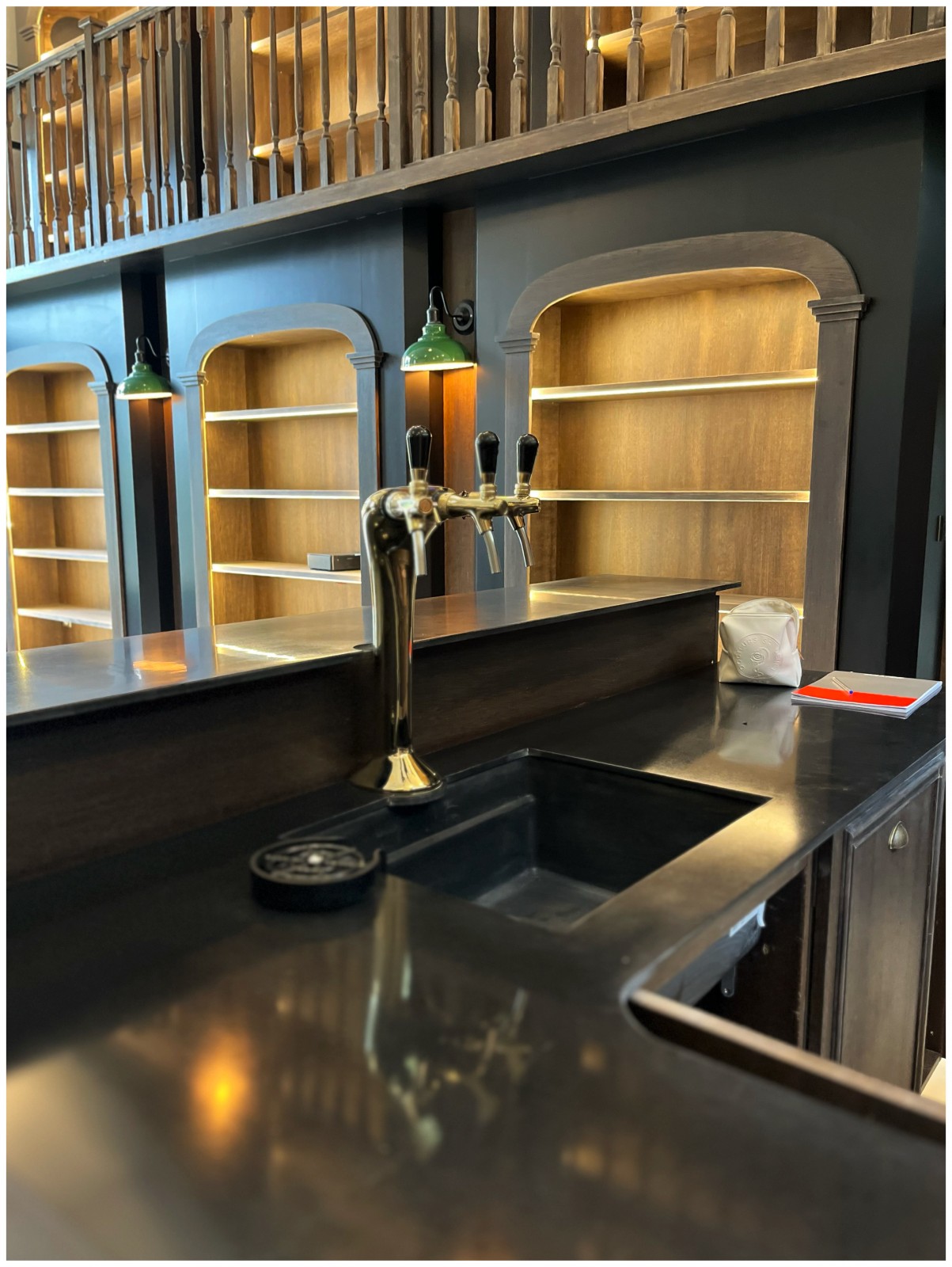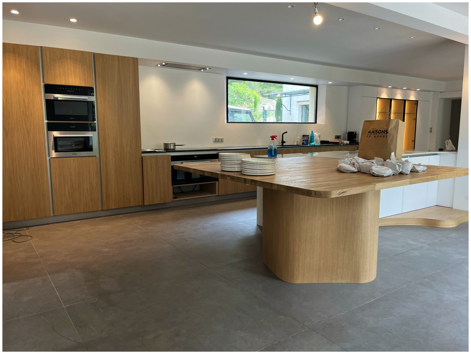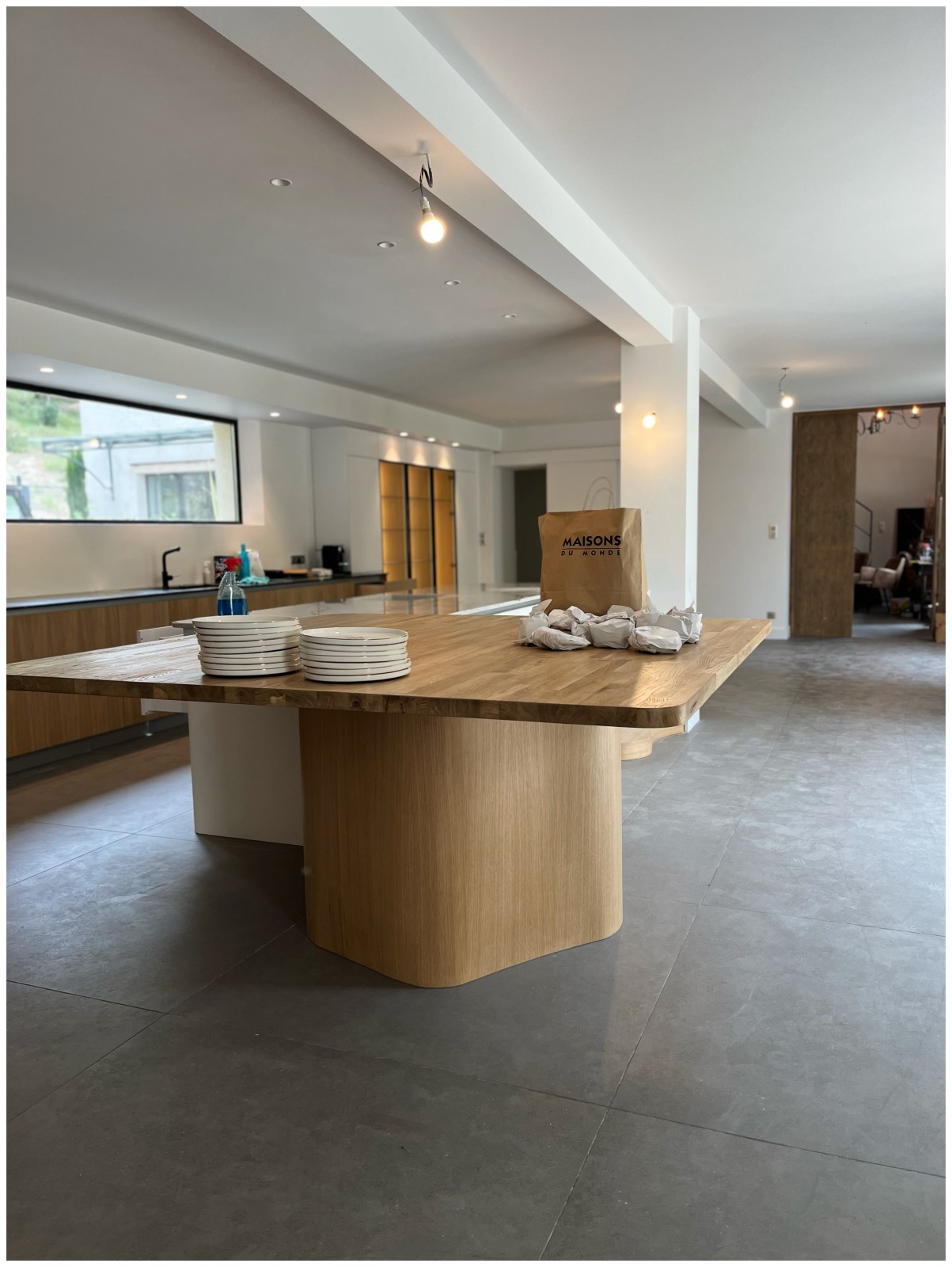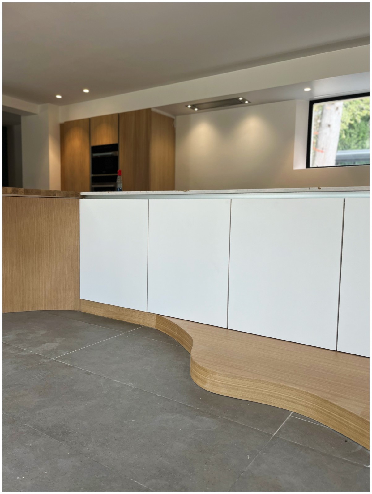 Ces formes libres se retrouvent également dans la cuisine. L'îlot, composé de deux parties, offre une composition libre de forme au niveau du piètement et de la base des meubles, en opposition à la forme rectangulaire et longue de la partie technique située à l'opposé.
