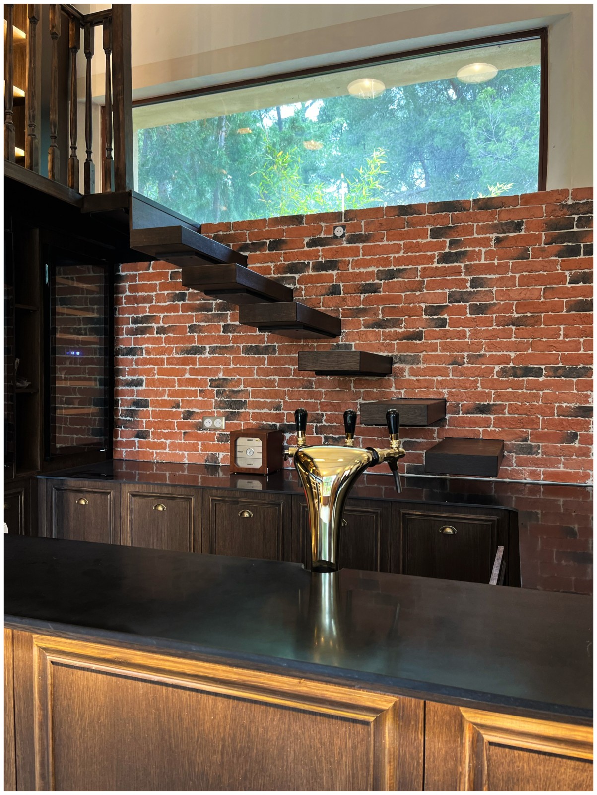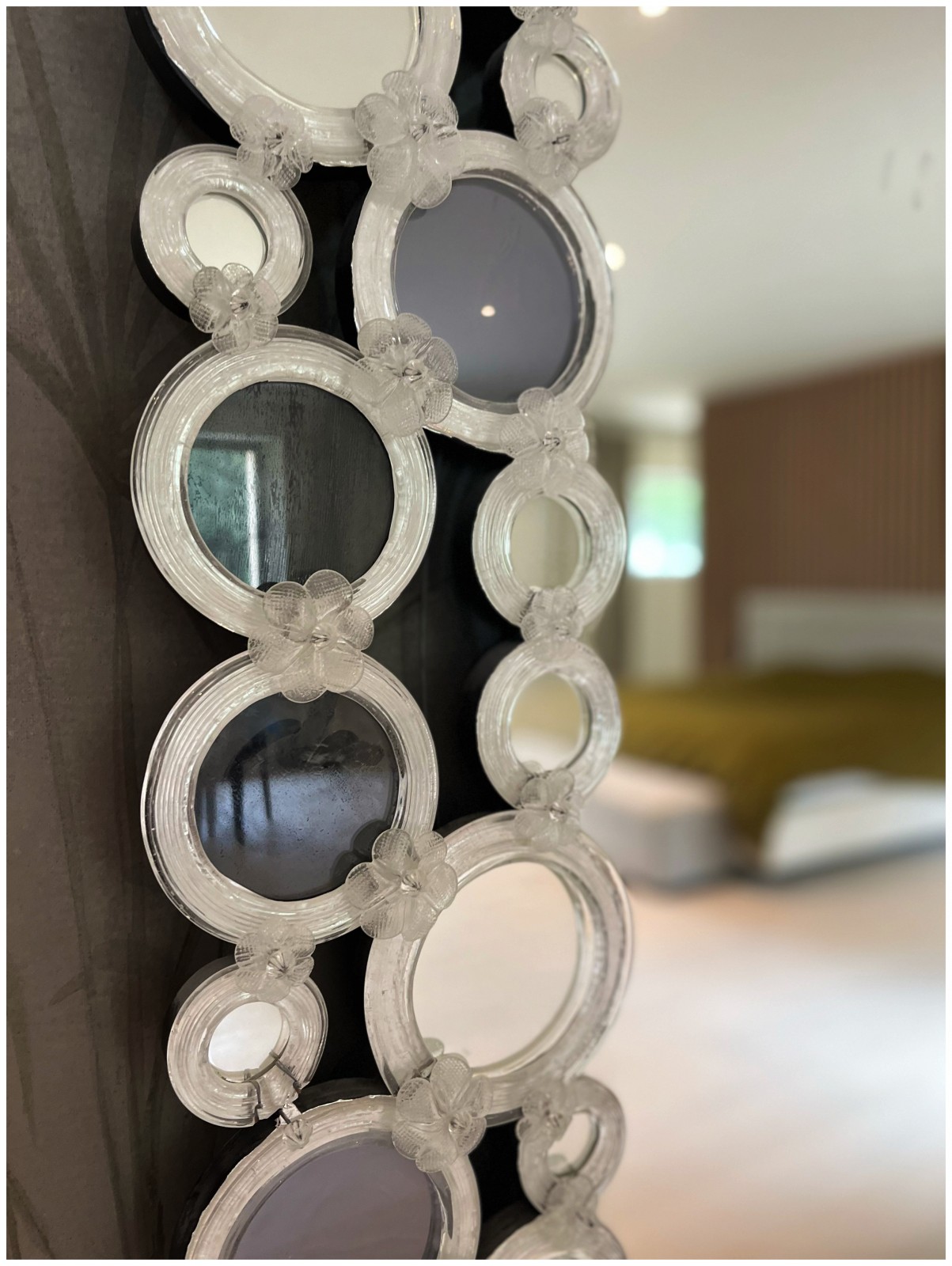À l'arrière du mas se trouve une partie plus intime, conçue comme un salon vintage avec des meubles foncés. Le mobilier choisi, en cuir, rappelle le travail des selleries, cher aux clients. La partie haute, composée des espaces nuit, débute par une chambre parentale avec une salle de bain ouverte, comprenant une baignoire en îlot et une douche à l'italienne, menant à une chambre ouverte au papier peint anglais recouvrant l'intégralité du mur sud, sublimée par un miroir dessiné et réalisé à Venise, en Murano.