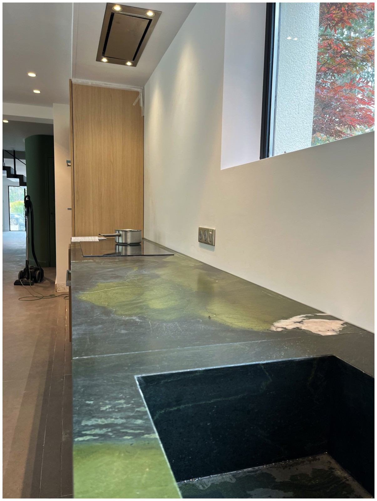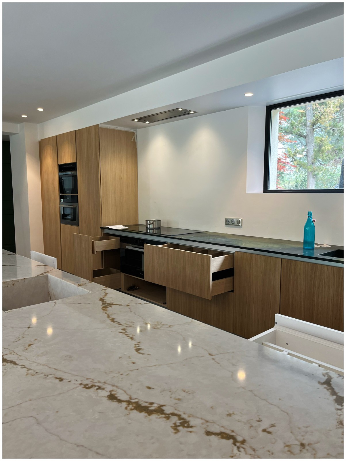 Pour les plans de travail, j'ai choisi deux matériaux différents : un granit effet marbre très clair et une pierre verte semi-précieuse, en harmonie avec les couleurs choisies pour l'ensemble de la maison. Le vert devient le maître mot de la rénovation, rappelant la nature environnante dans cette partie des Alpilles.