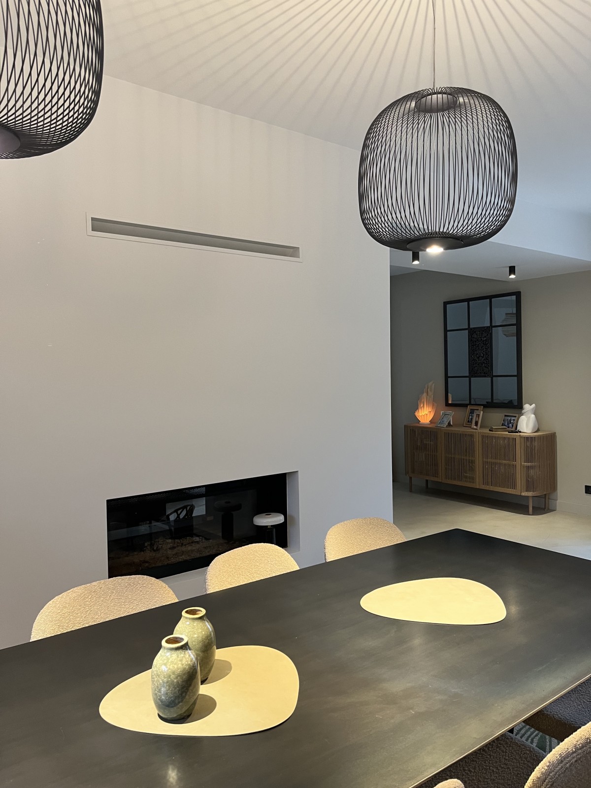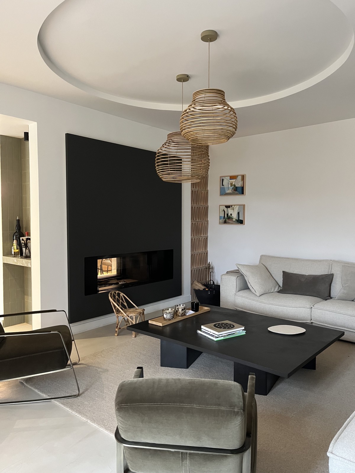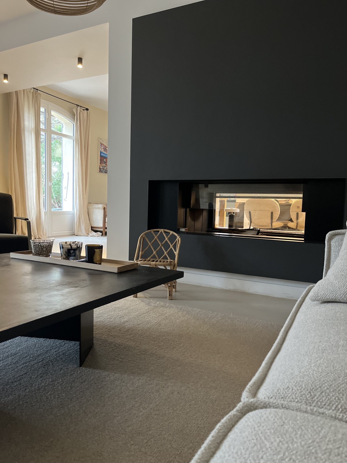 La cheminée existante, traversante et visible des deux côtés, a été entièrement repensée et refaite afin de devenir un élément central de l’espace de vie. Le faux plafond a également fait l’objet d’un travail spécifique : sa forme arrondie apporte de la douceur et vient casser la rigueur géométrique de cette pièce initialement très rectangulaire.