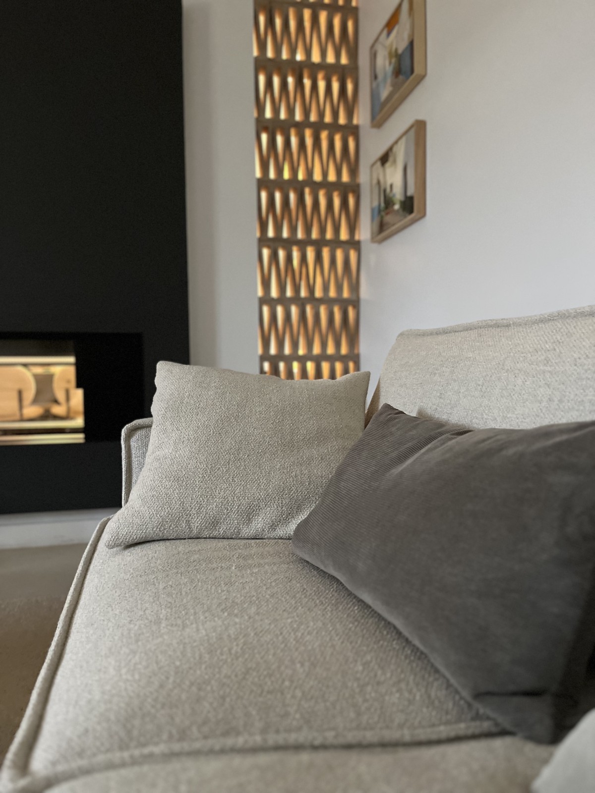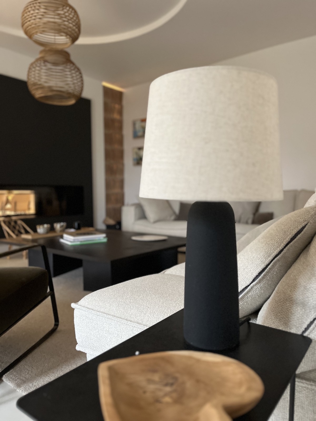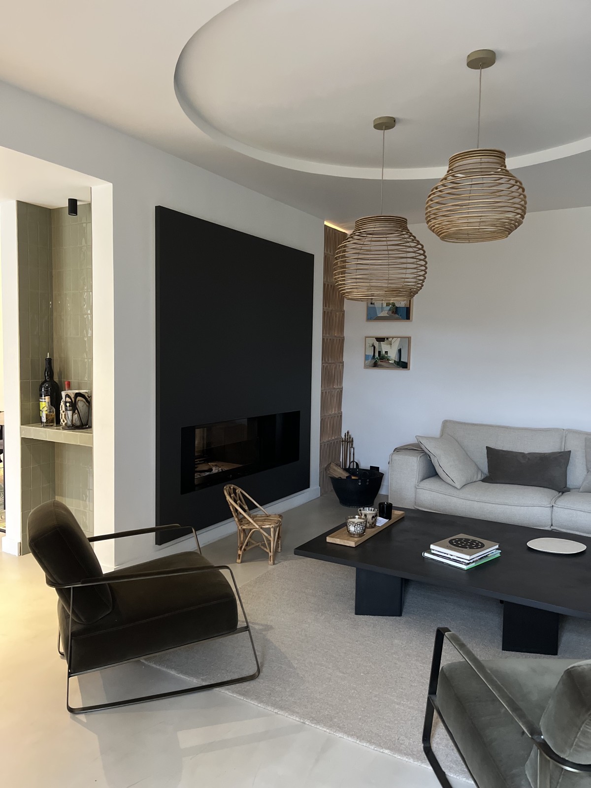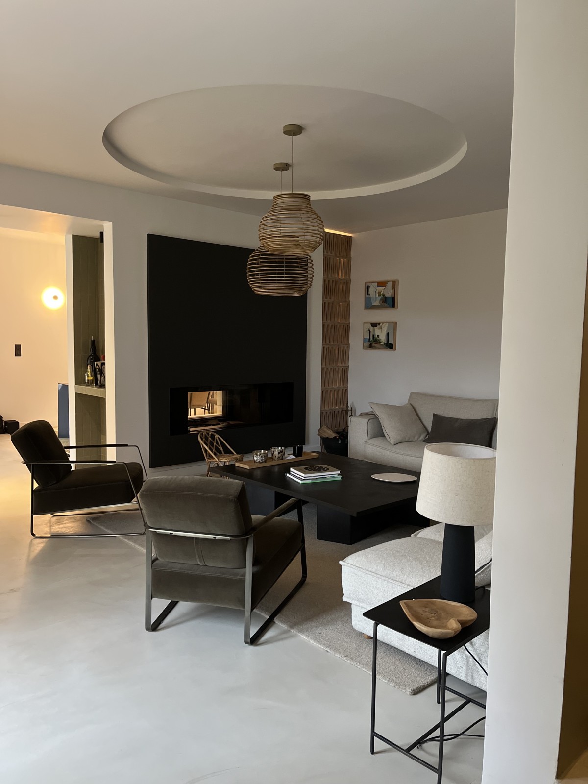 La cheminée existante, traversante et visible des deux côtés, a été entièrement repensée et refaite afin de devenir un élément central de l’espace de vie. Le faux plafond a également fait l’objet d’un travail spécifique : sa forme arrondie apporte de la douceur et vient casser la rigueur géométrique de cette pièce initialement très rectangulaire.