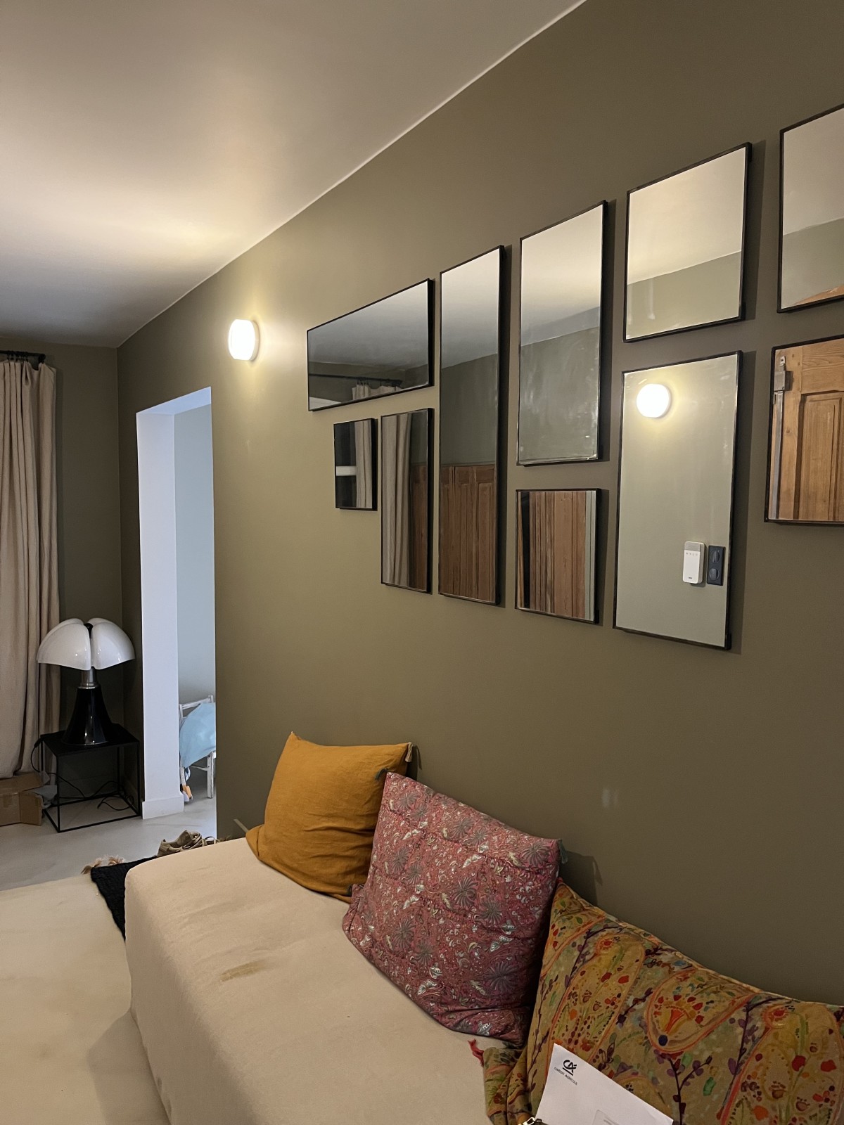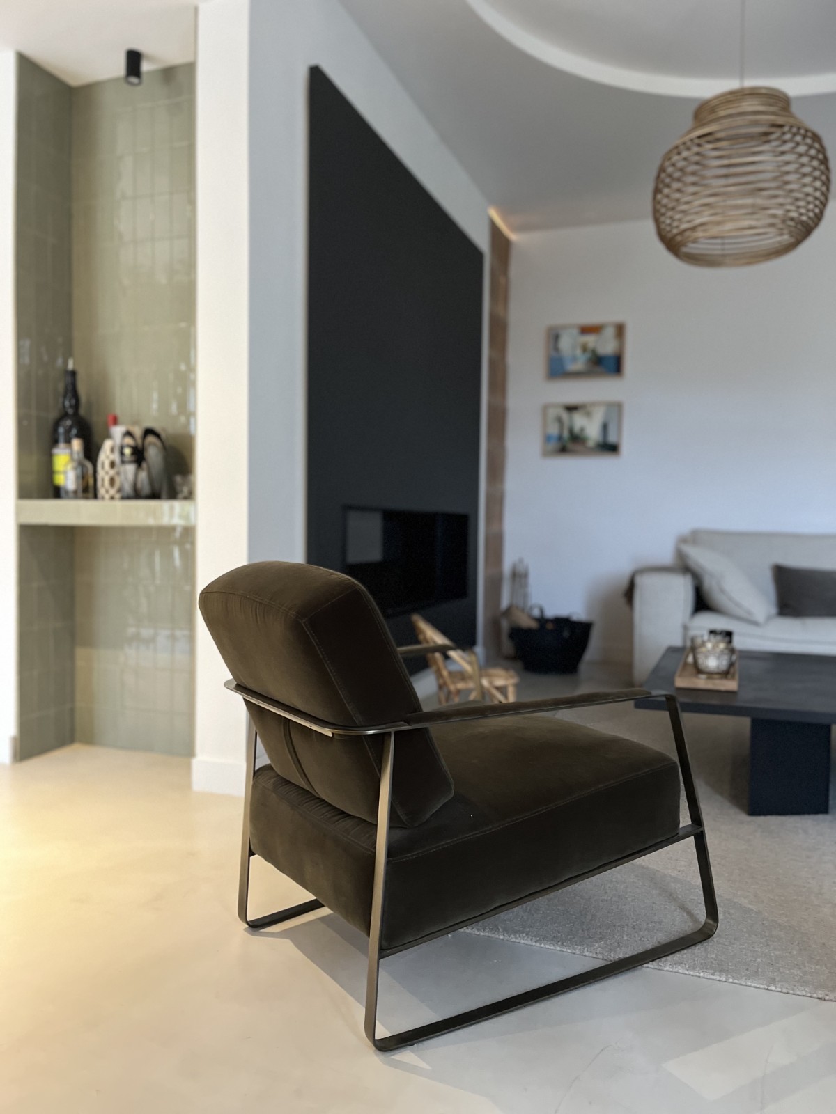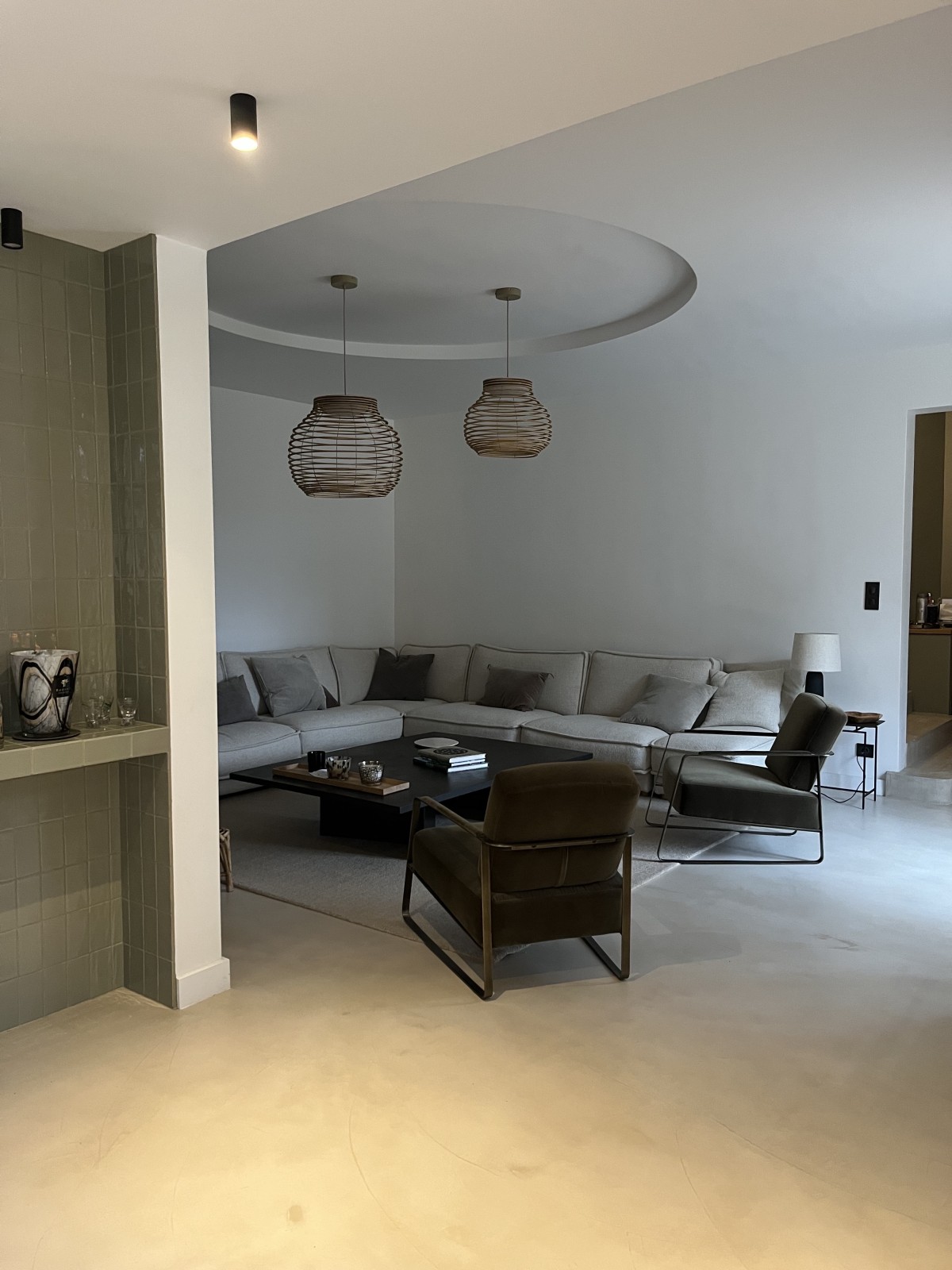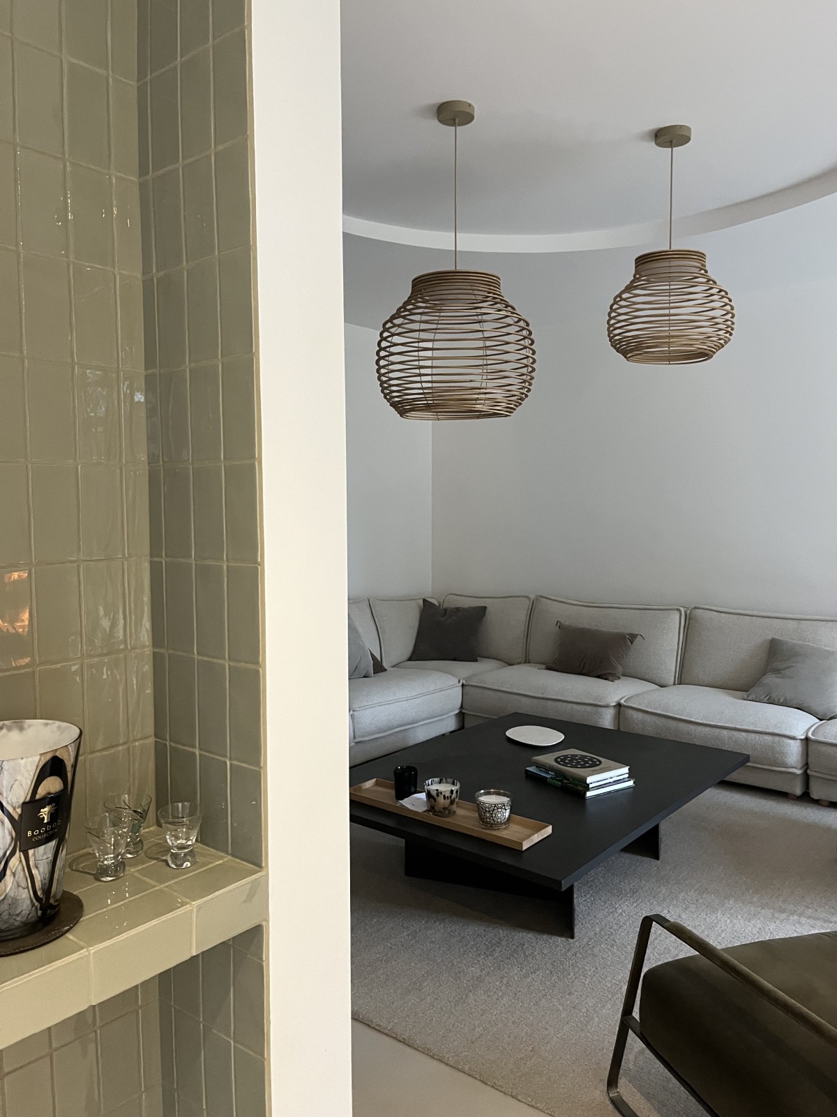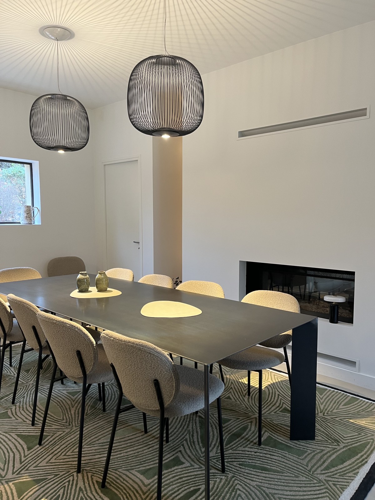 Les canapés et les tapis, par leurs matières naturelles — laine et coton — participent à l’atmosphère chaleureuse du projet et équilibrent la minéralité des sols. Dans la salle à manger, le tapis vert dialogue subtilement avec les céramiques vert d’eau installées dans la niche, renforçant la cohérence chromatique de l’ensemble.
