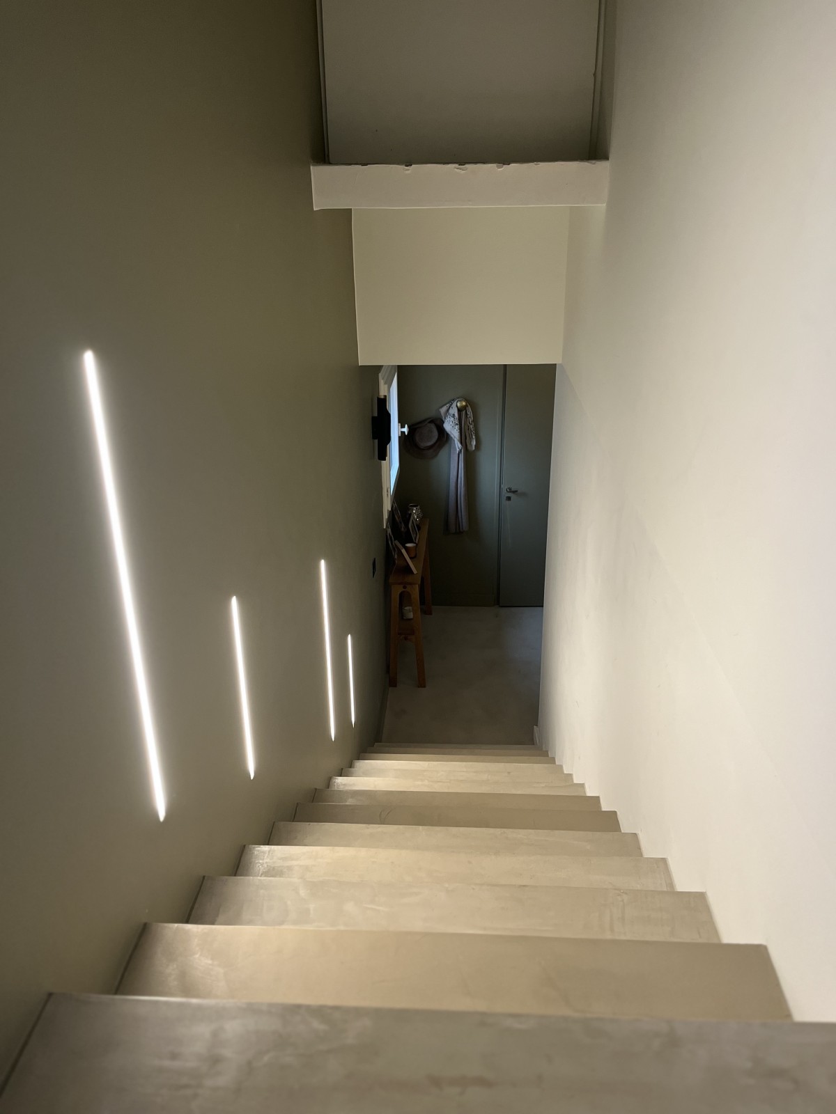 L’escalier a été souligné par un système de rétroéclairage intégré directement dans les murs. Discret et précis, il permet de matérialiser les circulations vers l’étage tout en créant une ambiance feutrée et élégante.