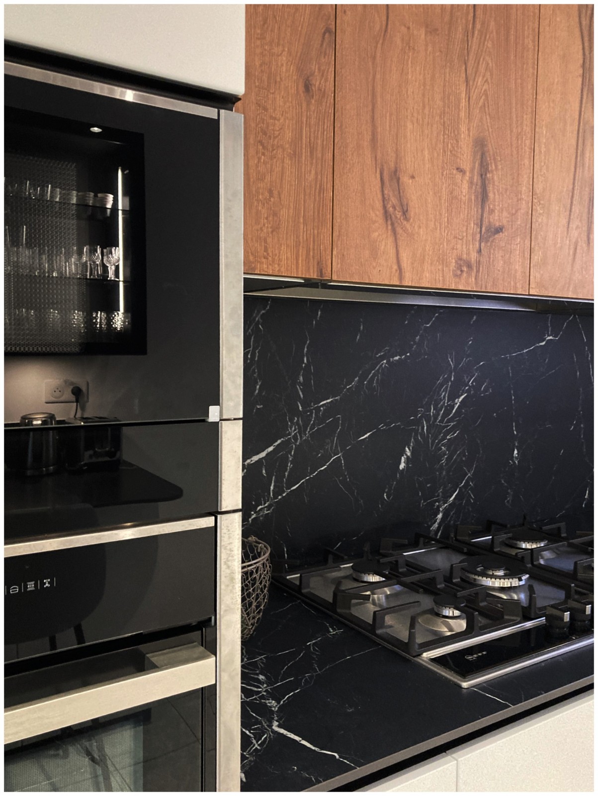 Les armoires noires vitrées apportent un côté très classieux à l’ensemble. Nous les avons rétro éclairées afin d'apporter des éclairages indirects dans la cuisine . Nous avons beaucoup travaillé la lumière dans cette maison afin d'apporter plus d'intimité et de douceur à l'ensemble.