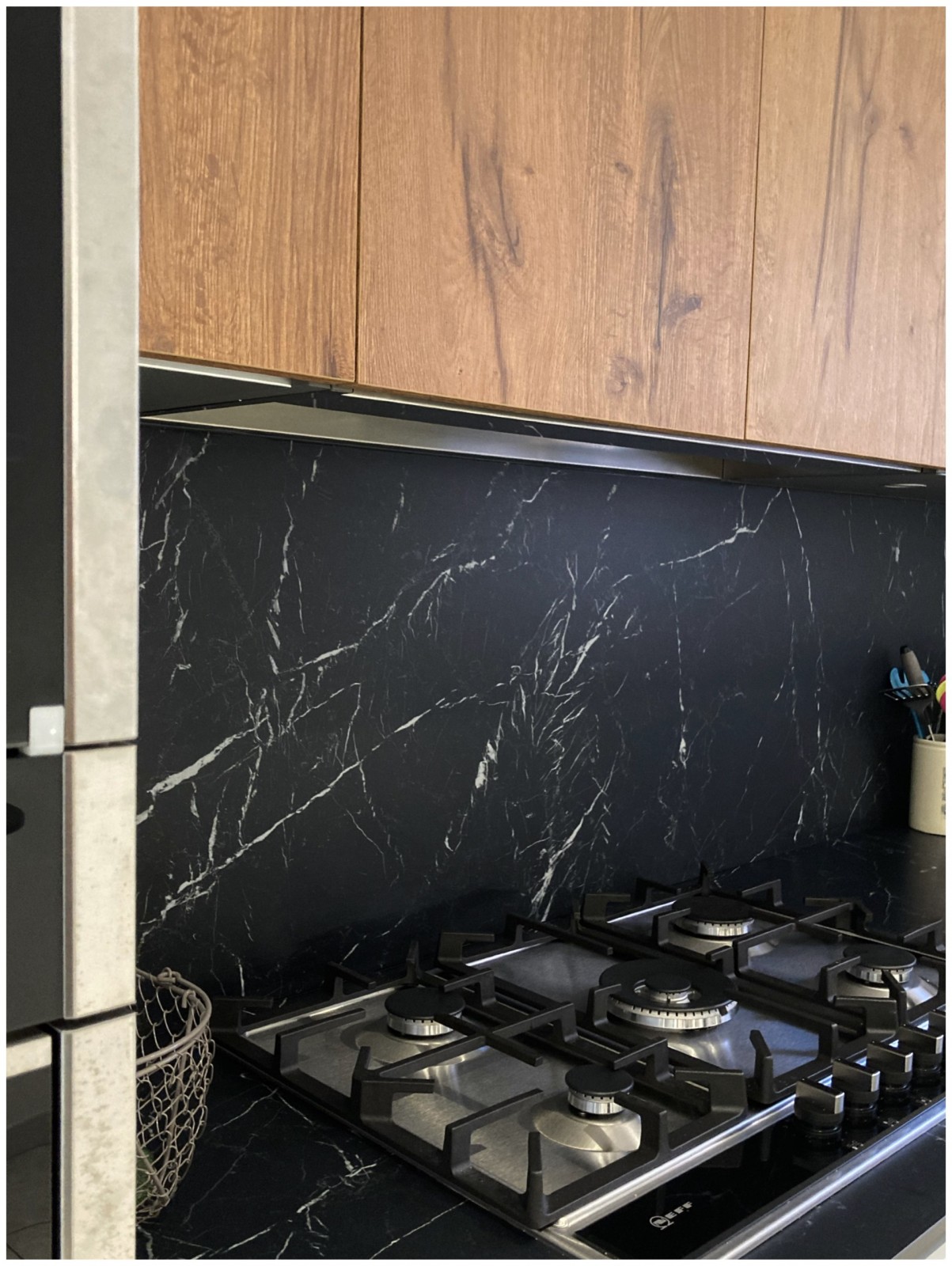 La cuisine a été réalisé en mélaminé chêne rustique pour les portes, une laque blanche d’un blanc adouci pour les autres éléments de la cuisine avec un plan de travail en céramique noir veiné de type marbre .