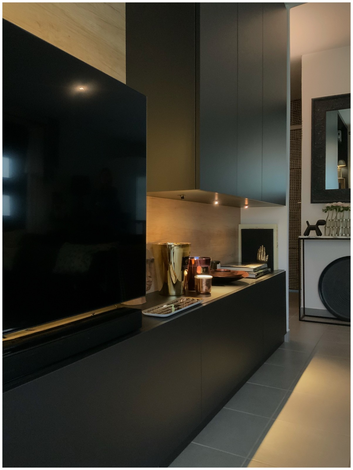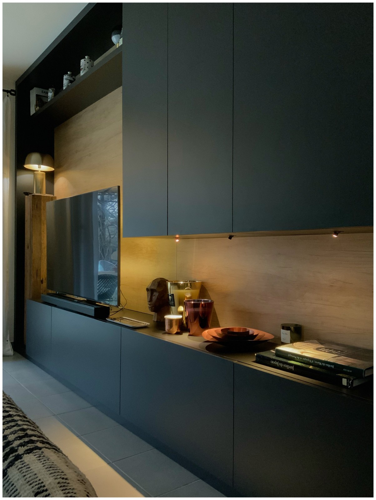 La cliente souhaitait revoir sa pièce à vivre afin de la rendre plus fonctionnelle : j’ai donc dessiné un aménagement sur mesure qui réponde à plusieurs fonctions : meuble tv , bibliothèque, rangements ouverts et fermés, espace d’exposition rétro éclairé orientable afin de mettre en valeur tous les beaux objets de la cliente.
