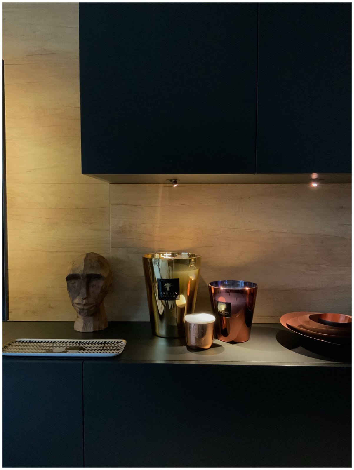 Un travail très élégant marqué par le mélange du chêne doré et des étagères et rangements noirs . Le noir est un des fils conducteurs de cette maison , rythmé par des objets graphiques et parfois colorés.