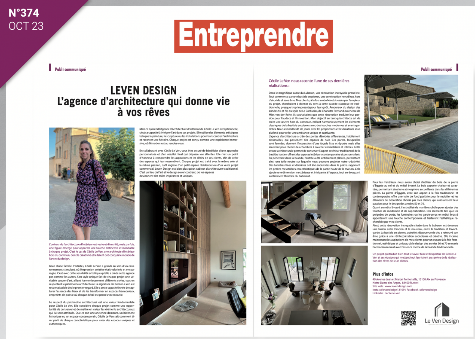 Retrouvez le Magazine Entreprendre en kiosque dès maintenant et laissez-vous inspirer par l'Agence Levendesign, une véritable référence dans le domaine de la création architecturale et artistique.