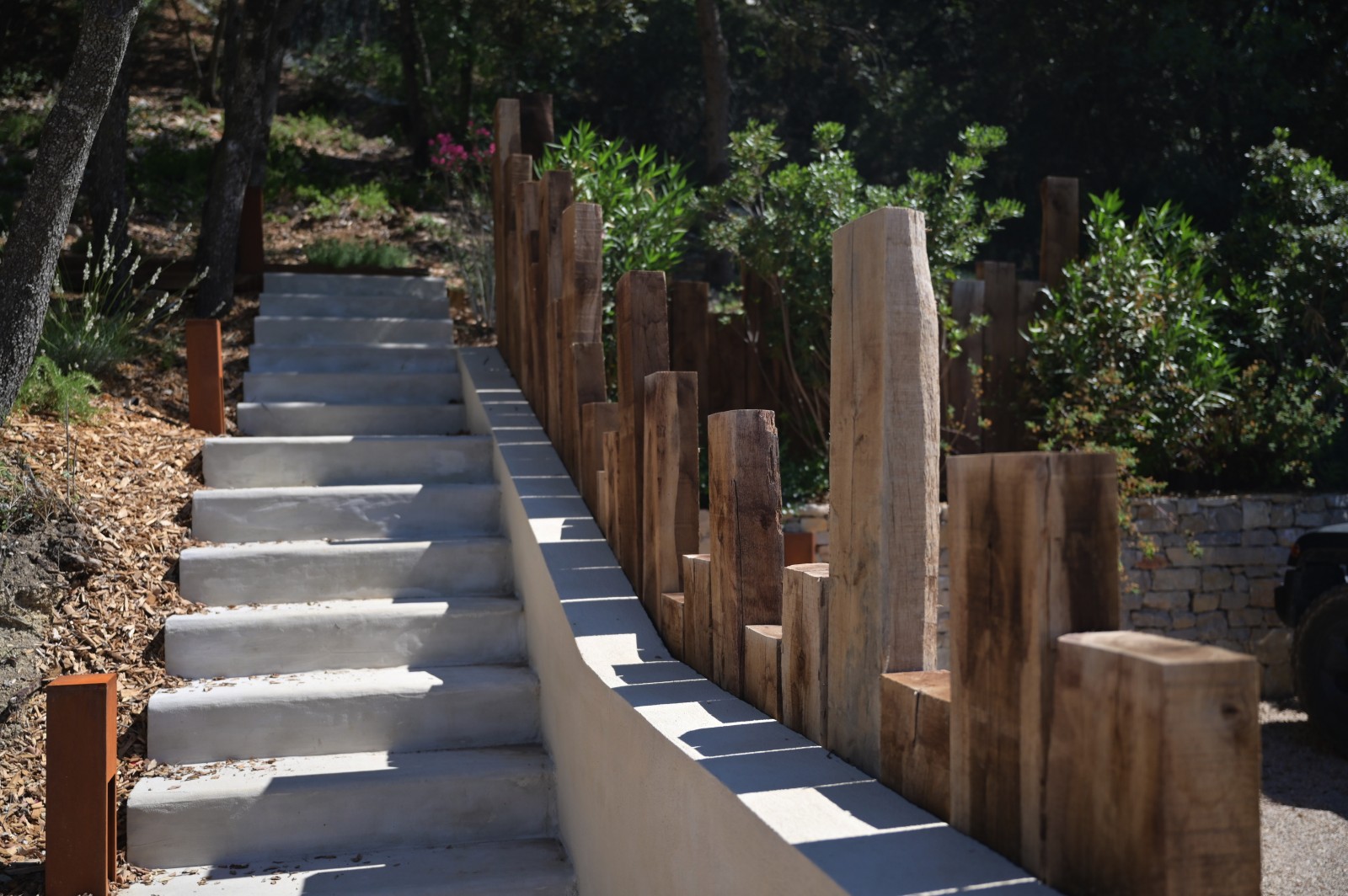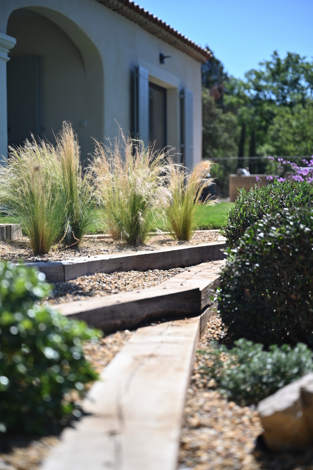 Des plantes grimpantes caressent les murets en pierre, tandis que des traverses en bois délimitent délicatement les différentes zones du jardin, offrant ainsi une structure rythmique naturelle.