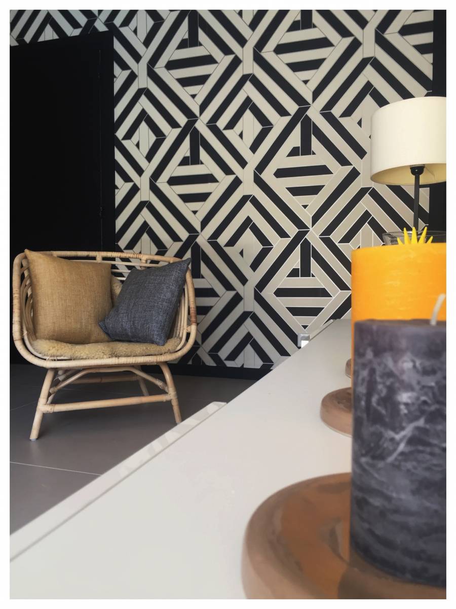 Nous avons les espaces de vie à l'étage et les espaces de nuit en bas avec vue sur la piscine , nous avons joué avec les papiers peints dans l'entrée, les toilettes, le couloir du rez de chaussée afin d'amener histoires visuelles et graphismes.
