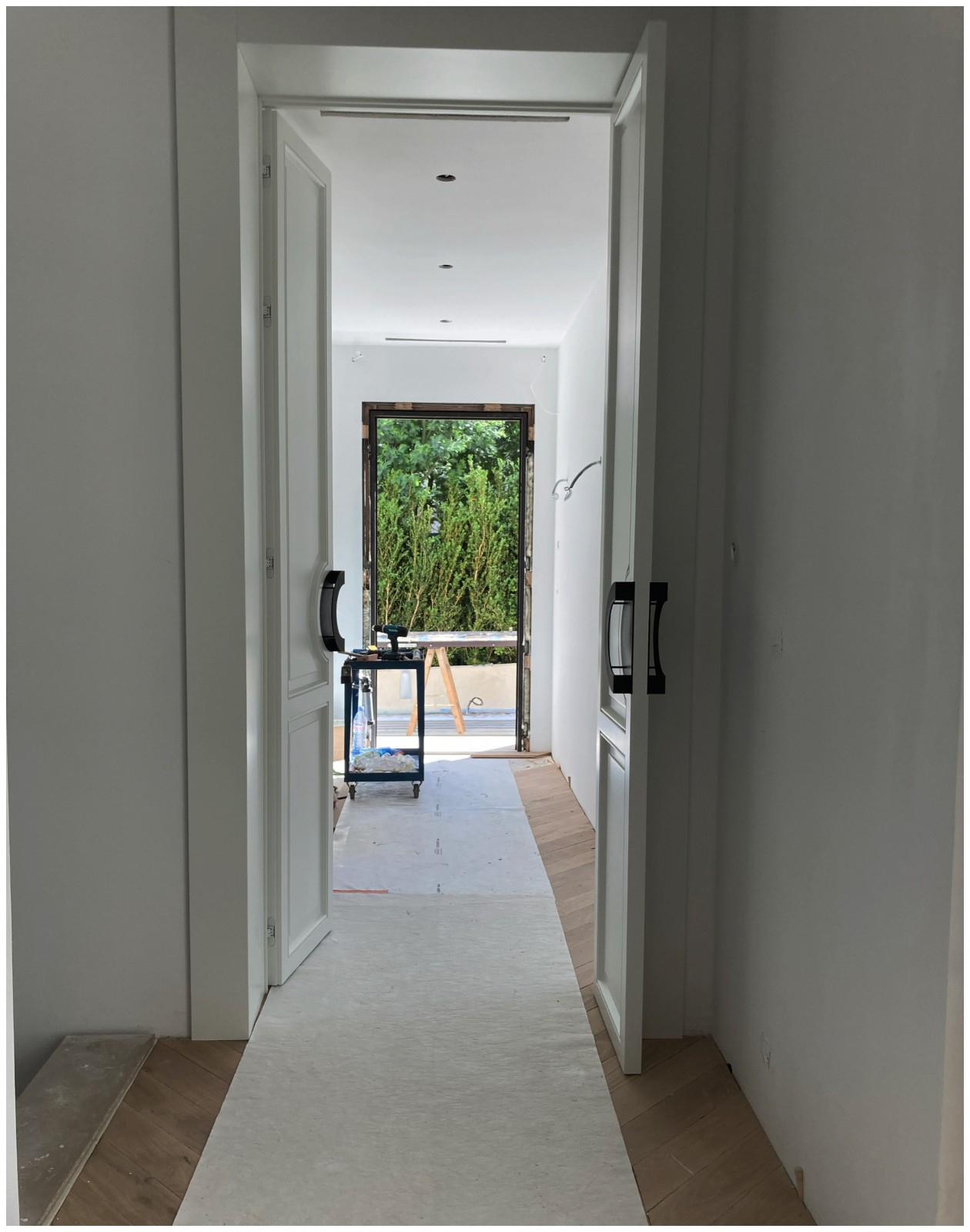 Le métal noir des portes et des gardes de corps amène un côté graphique à l’ensemble la mise en valeur par le blanc des portes sur un plancher ancien en provenance directe de Belgique.