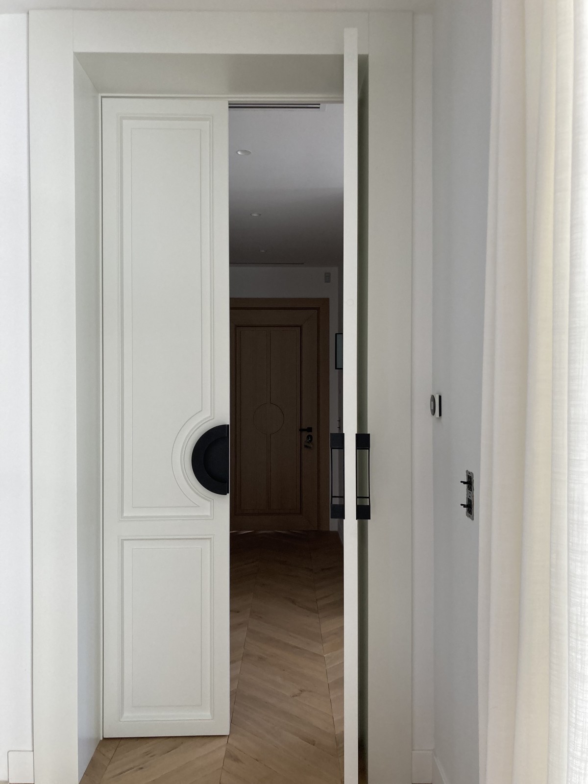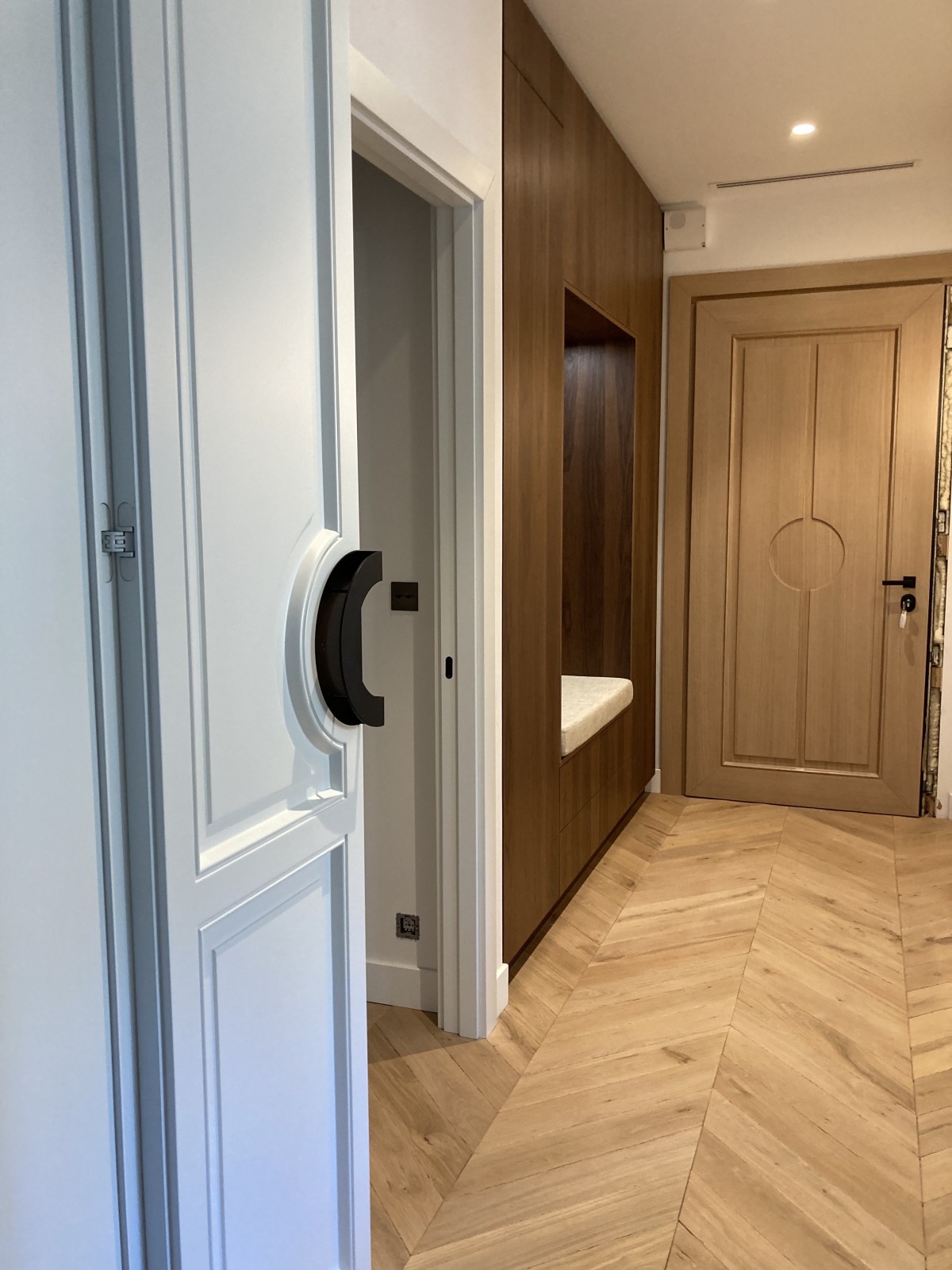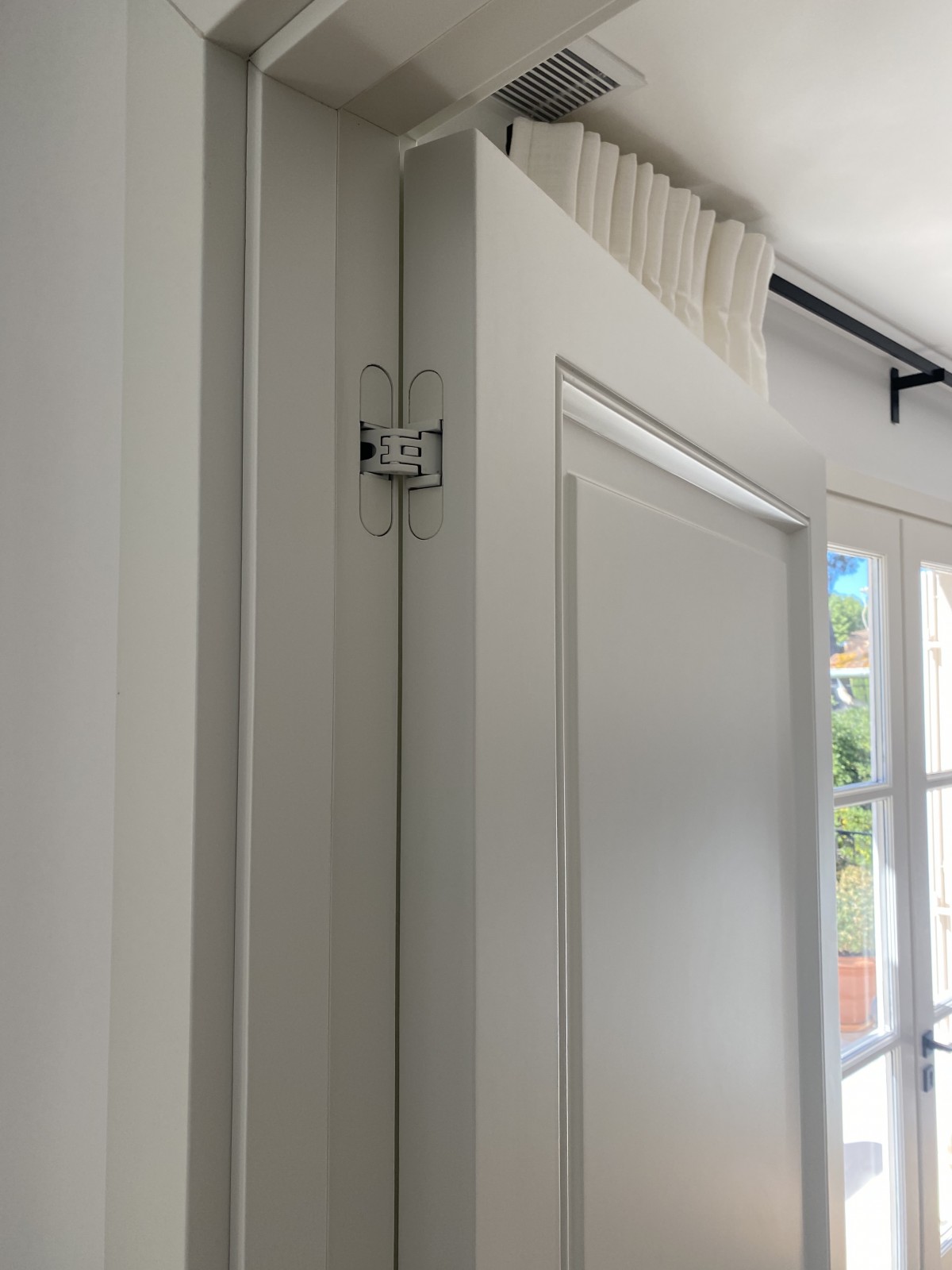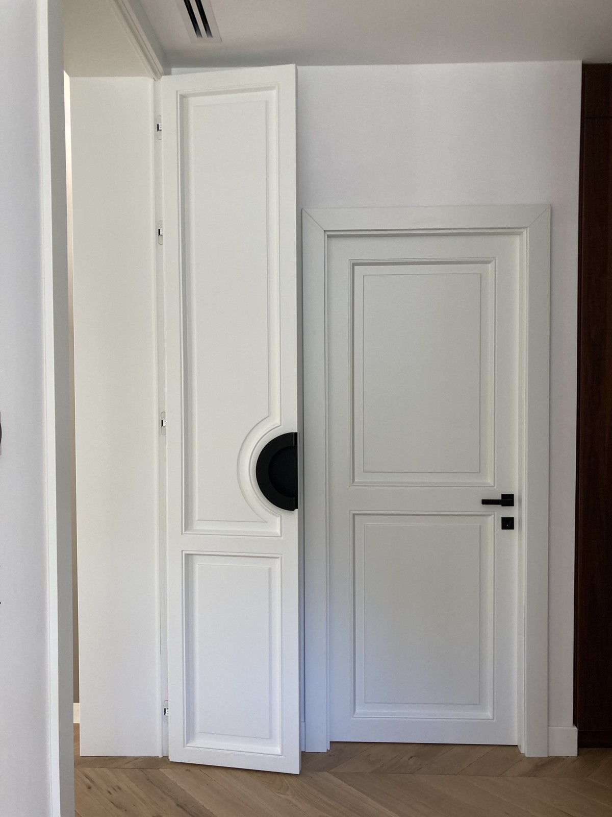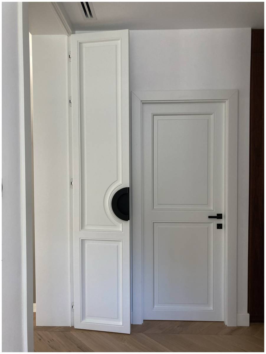 Chacune des portes a été dessinée par l’agence de design avec un souci du détail, des charnières invisibles donnant un effet très minimaliste à l’ensemble des volumes dessinés par l'architecte d'intérieur .