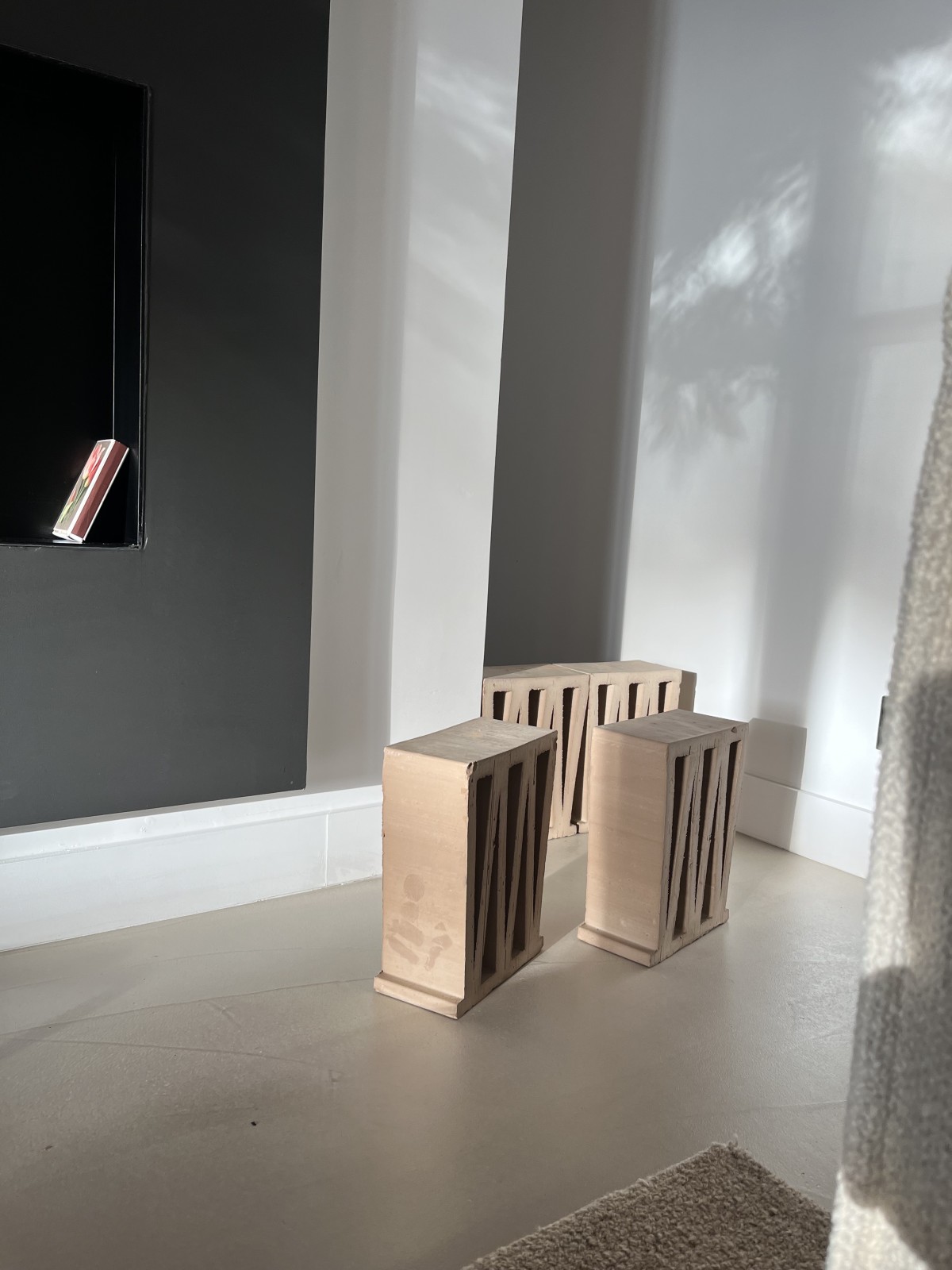 Pour l'intérieur, j'ai opté pour l'application d'un béton ciré beige, clair et apaisant, ainsi que des touches de vert kaki rappelant le paysage environnant naturel riche et florissant.