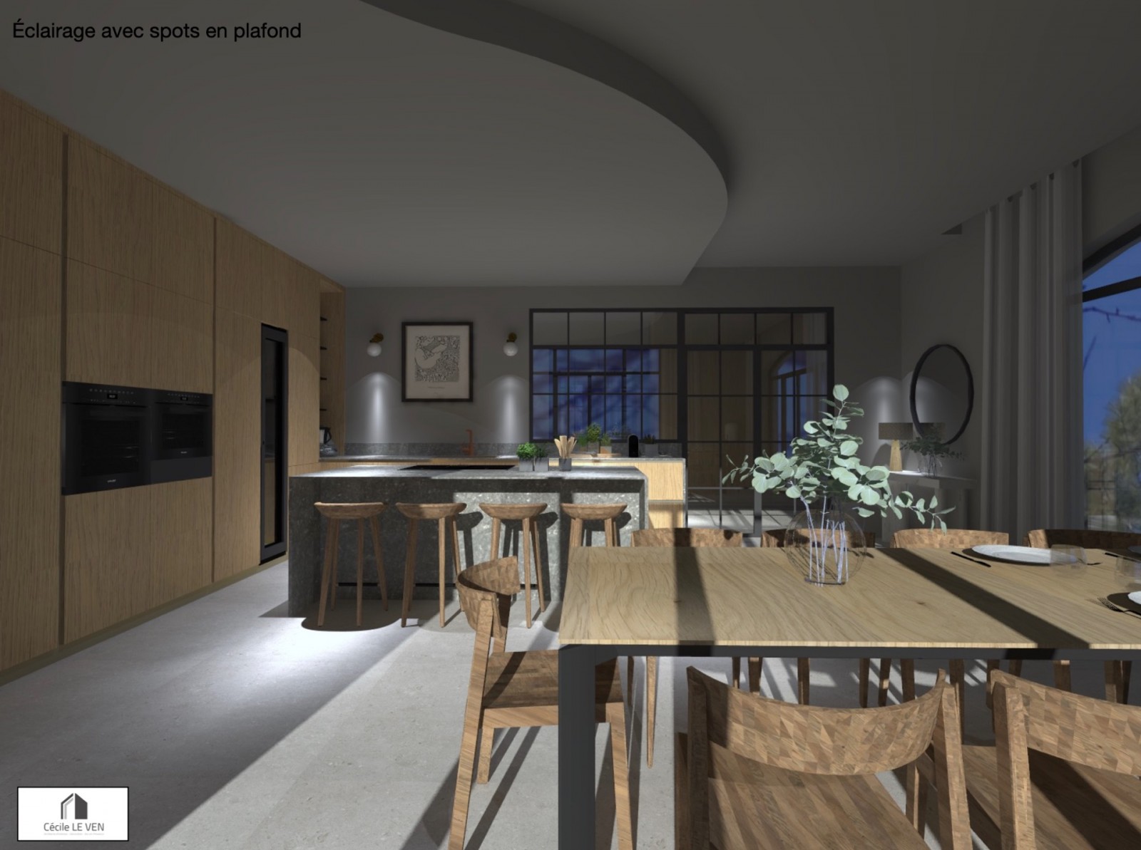 L'agencement de la cuisine, orienté vers l'extérieur, maximise l'interaction avec la piscine et la nature environnante. L'intégration fluide de l'espace extérieur dans le design intérieur renforce la symbiose entre l'intérieur et l'extérieur.