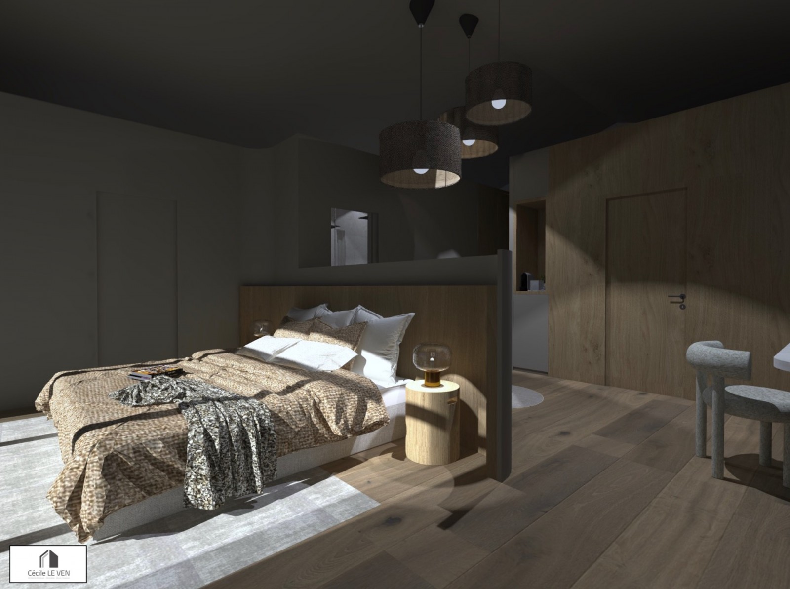 Chaque détail a été minutieusement conçu, comme si les clients séjournaient dans un hôtel de luxe. La suite parentale incarne ce concept, offrant une coiffeuse, un coin thé-café, une spacieuse salle de bain avec douche et baignoire, ainsi qu'un dressing sur mesure, fusionnant élégance et fonctionnalité.