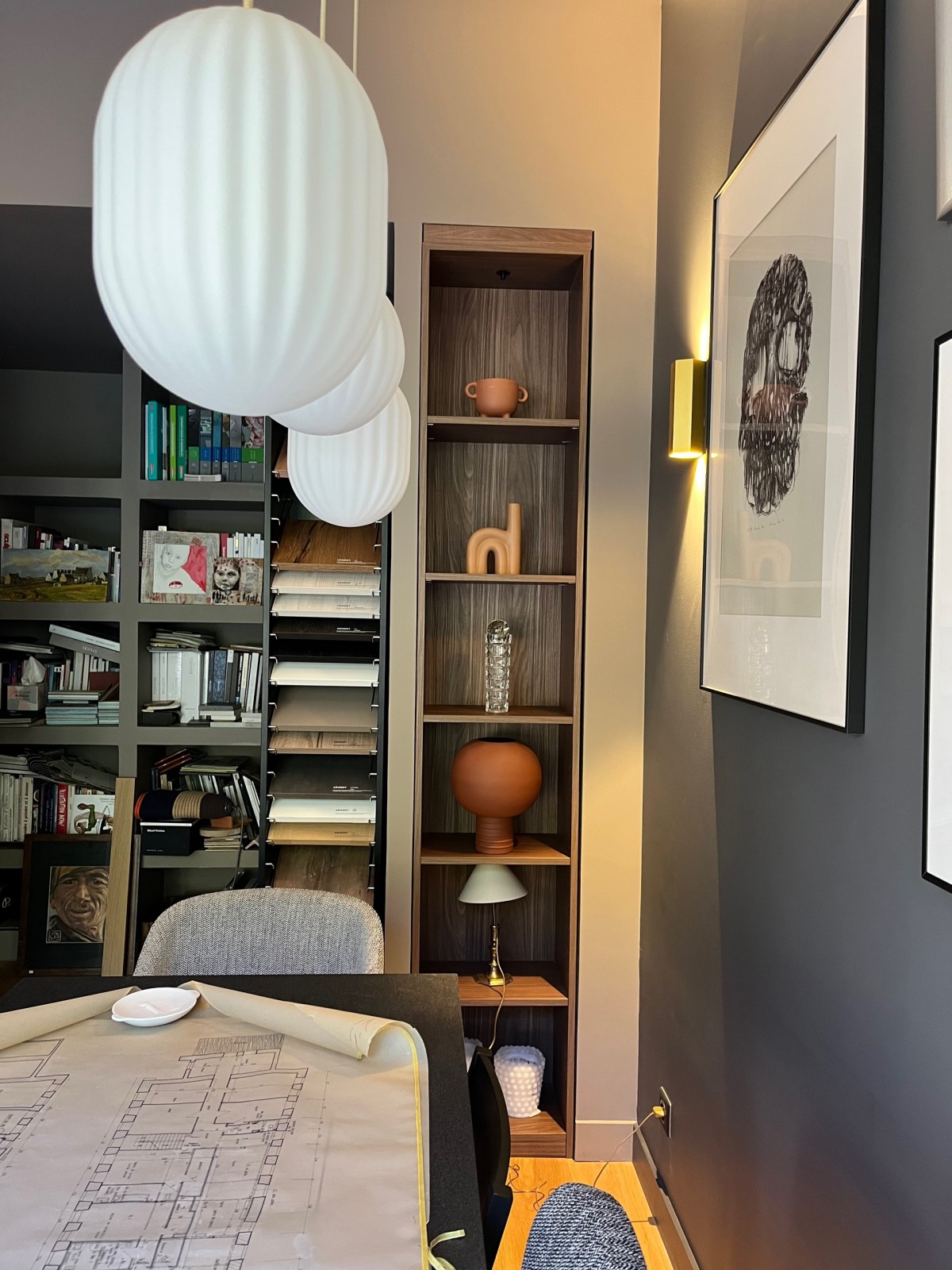 La matériauteque a été crée comme un cocon avec une couleur chaude et rabattue qui permet d’unifier l’ensemble alors que l’espace de travail est marqué par un gris anthracite très présent afin de mettre en valeur les gravures collectionnées par Cécile Le Ven, qui en tant qu'artiste est passionnée par l'Art .