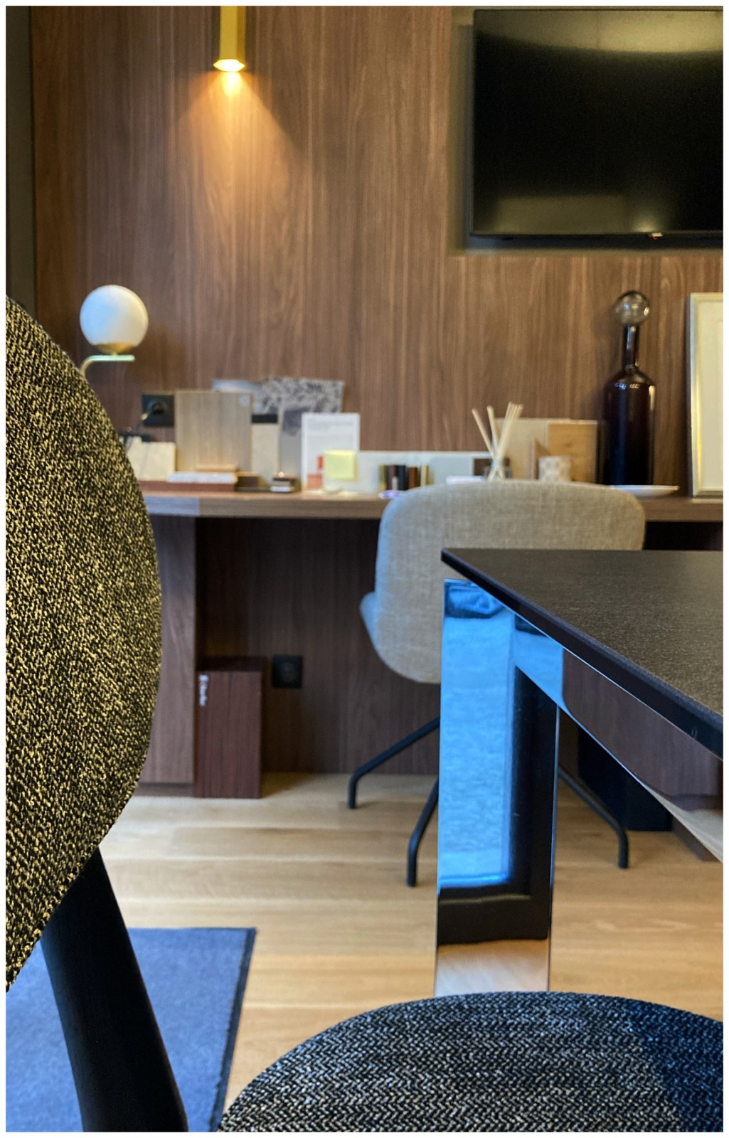 Un plaquage de noyer réchauffe l’ensemble et de lui donner un caractère très chic et très élégant. Un mélange de formes et de couleurs féminines et masculines : un mix and match qu'elle affectionne tout particulièrement.