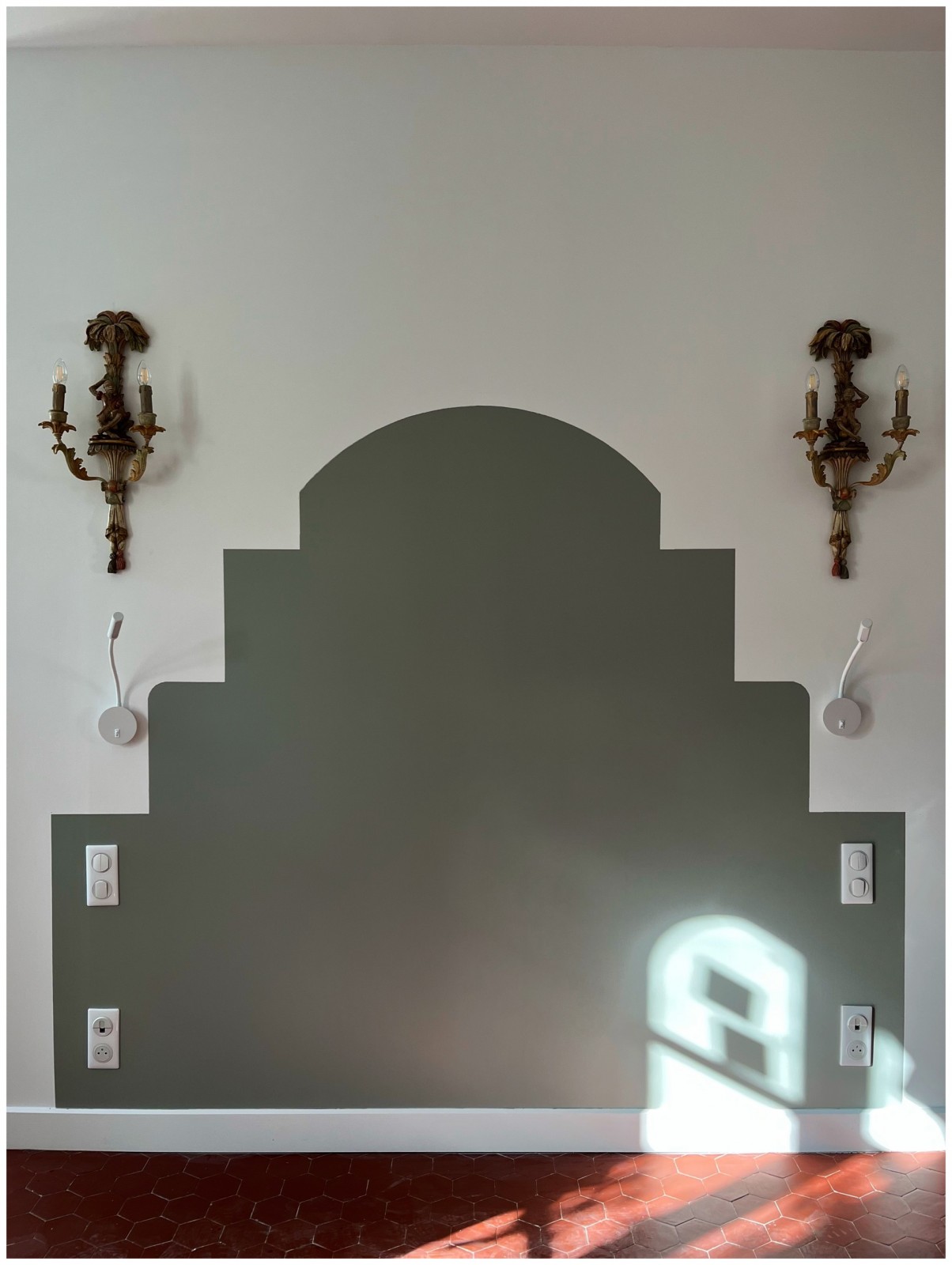 Les raccords de sol se sont souvent posés : donc nous avons fait appel aux talents de designers pour imaginer des décors en accord avec le thème des pièces: cette plume gris sur fond rouge pour rappeler la lecture et l'écriture : un mélange savamment géré avec des touches de poésie disséminé partout dans la maison.