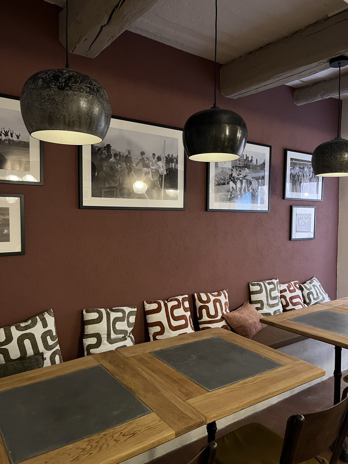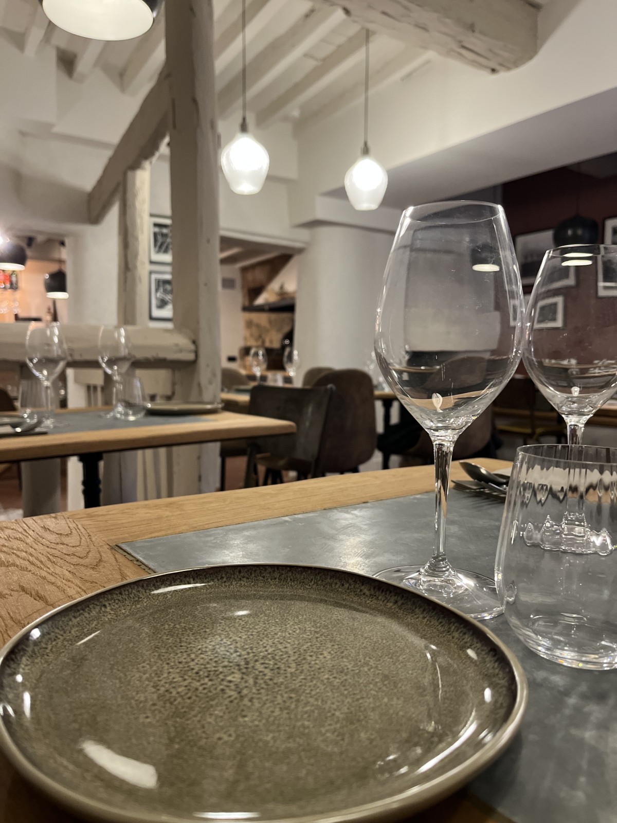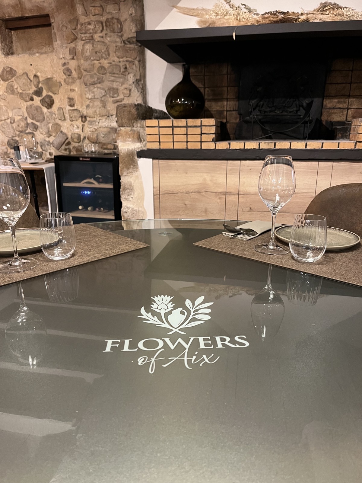 L’ambiance du lieu s’articule autour d’une couleur profonde lie de vin, appliquée sur les murs, évoquant à la fois la terre, la matière et les vignobles du monde. Cette teinte intense dialogue avec des nuances plus douces de lin, de blanc et de tons minéraux, mettant en valeur les poutres apparentes et apportant équilibre et luminosité à l’ensemble. Le résultat : une atmosphère cosy, élégante et enveloppante, idéale pour manger dans un restaurant à Aix et s’y attarder.