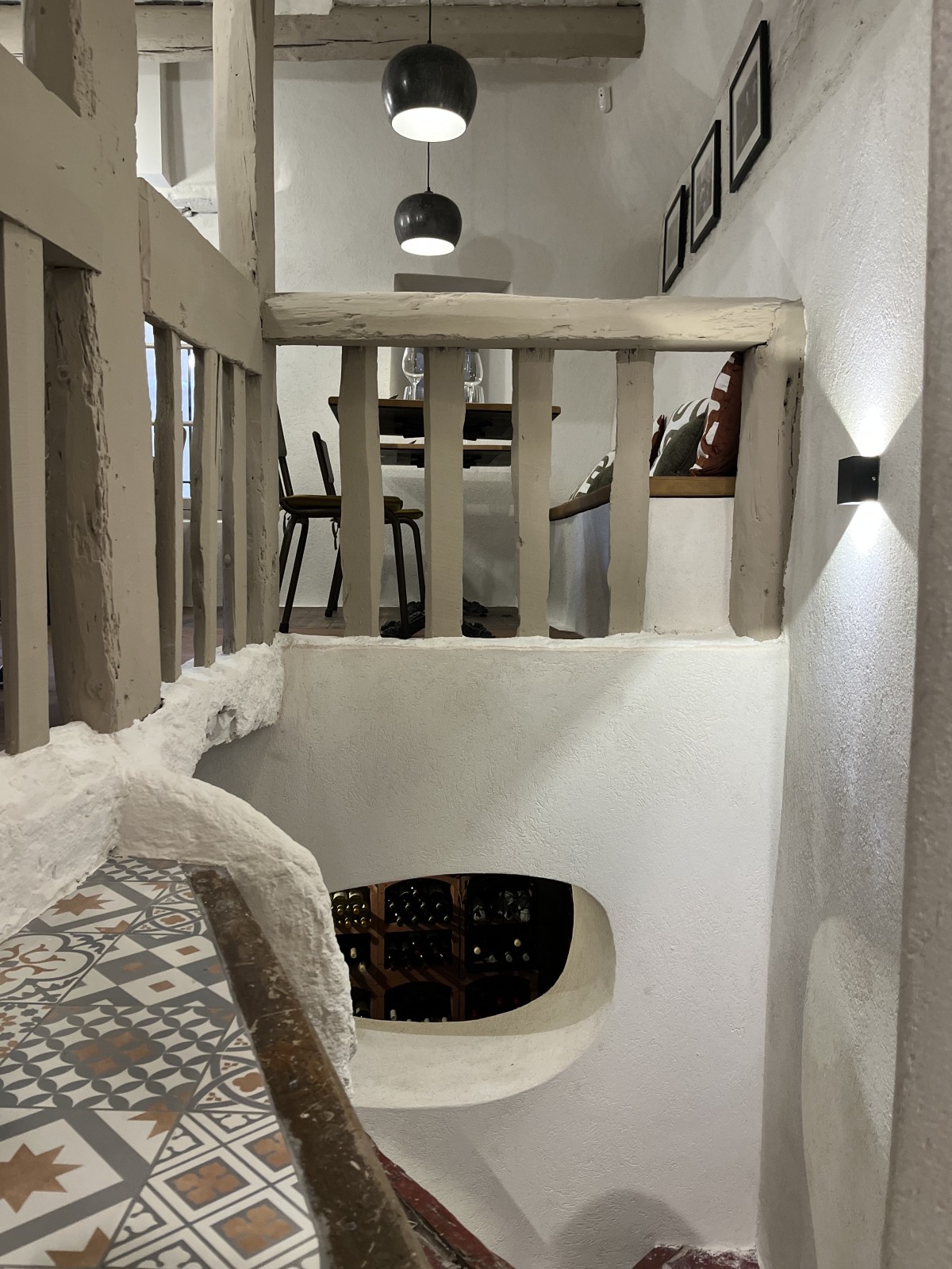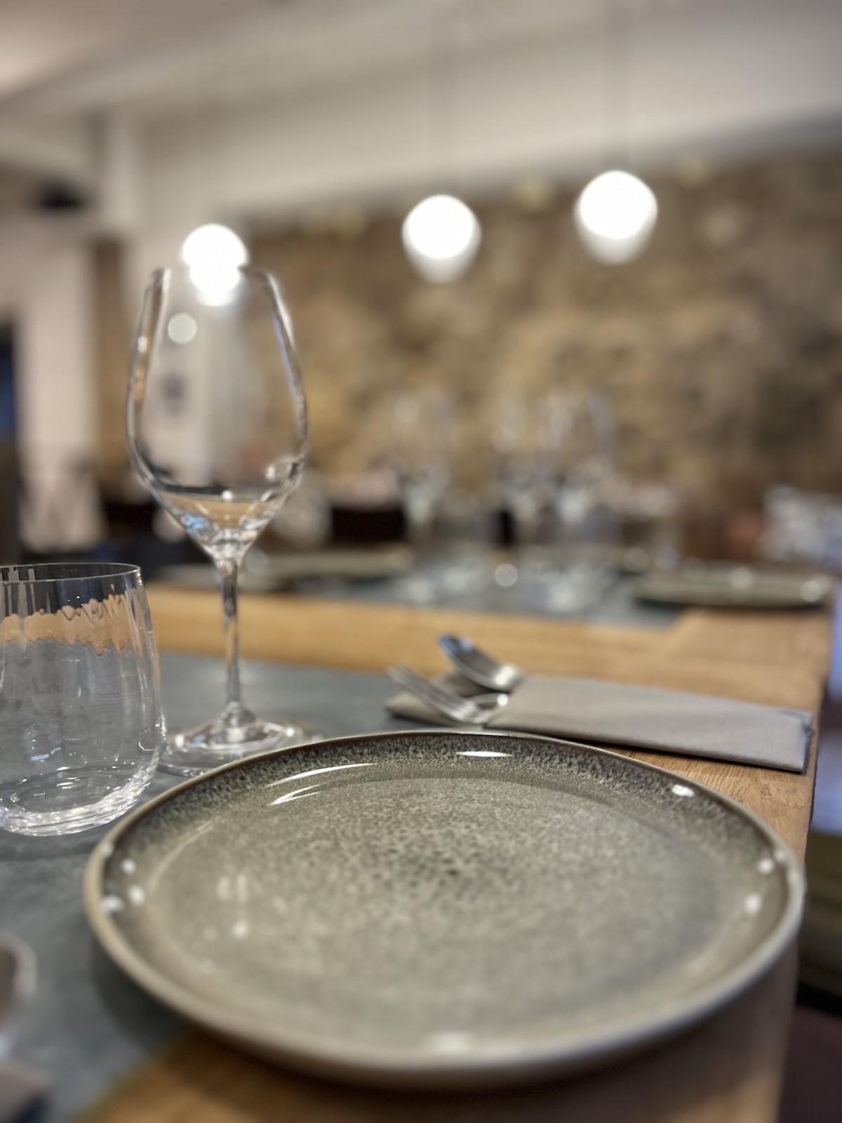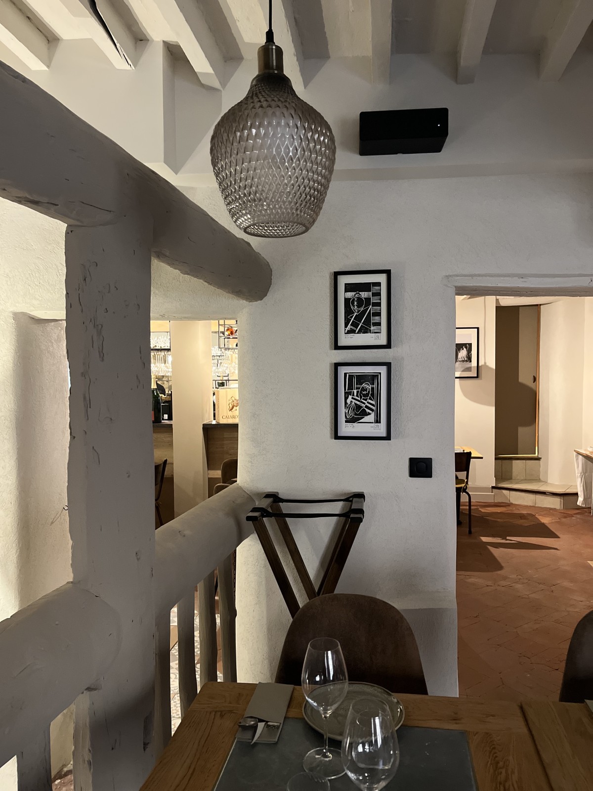 L’ambiance du lieu s’articule autour d’une couleur profonde lie de vin, appliquée sur les murs, évoquant à la fois la terre, la matière et les vignobles du monde. Cette teinte intense dialogue avec des nuances plus douces de lin, de blanc et de tons minéraux, mettant en valeur les poutres apparentes et apportant équilibre et luminosité à l’ensemble. Le résultat : une atmosphère cosy, élégante et enveloppante, idéale pour manger dans un restaurant à Aix et s’y attarder.