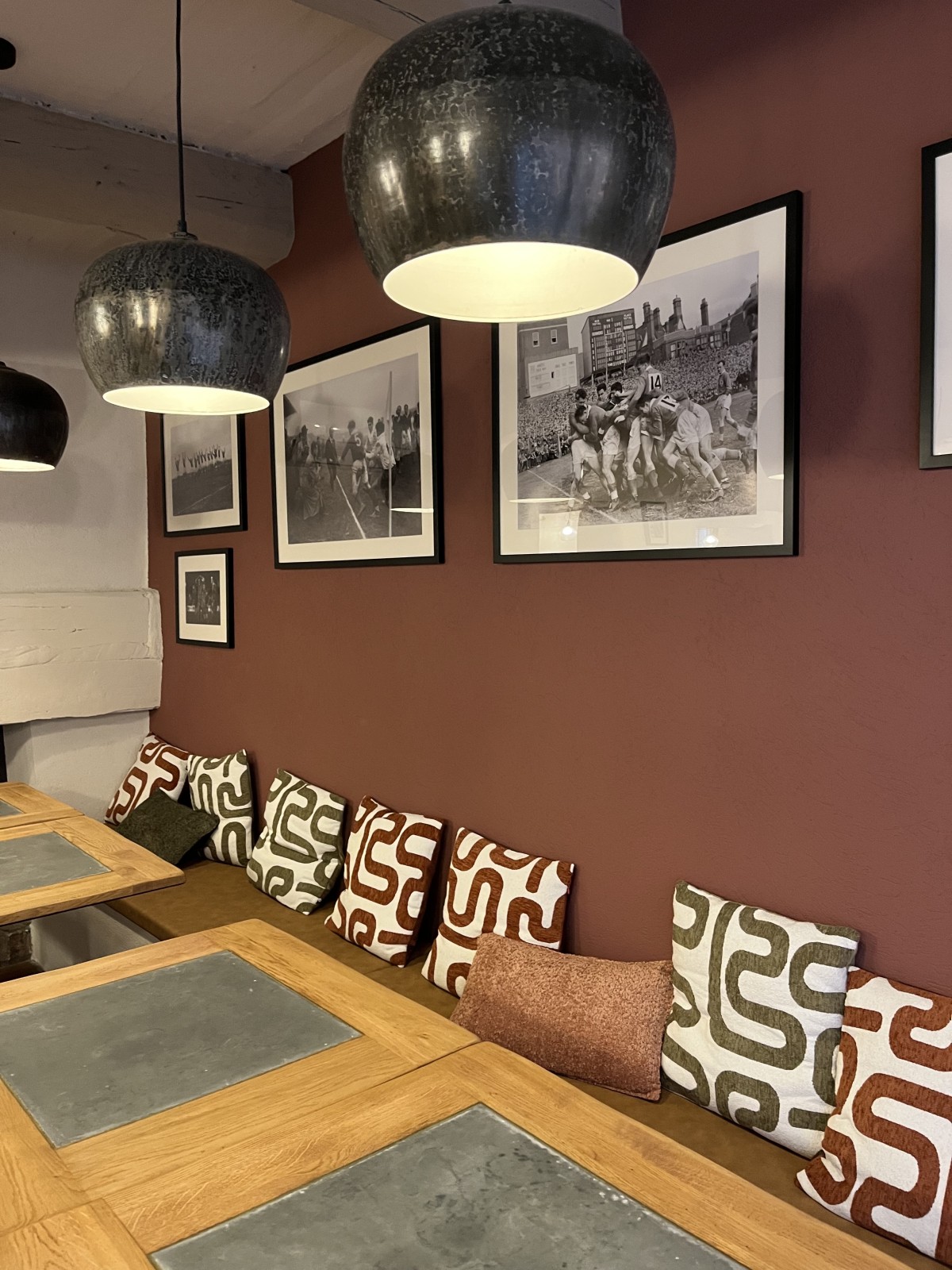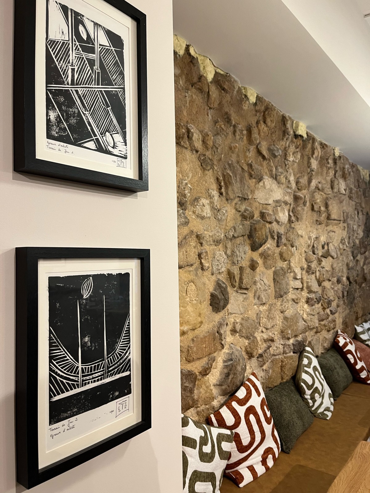 Enfin, l’identité artistique du lieu s’exprime à travers une série de gravures originales réalisées par l’artiste et architecte d’intérieur Cécile Le Ven, spécialement conçues pour le propriétaire. Ces œuvres, inspirées par l’univers du rugby, sport qu’il affectionne particulièrement, renforcent la dimension personnelle du projet et font du restaurant un lieu unique, vivant et sincère.
