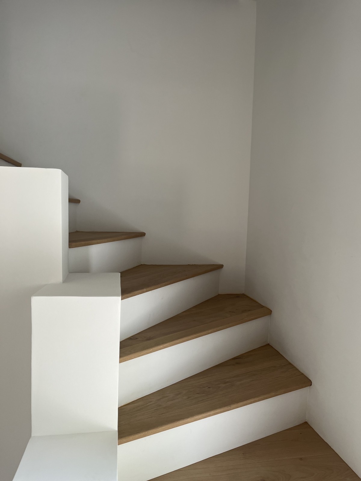 L’escalier, conçu en béton et chêne, devient une pièce maîtresse de la maison. Pour structurer l’entrée, nous avons intégré la celosia de Patricia Urquiola, apportant cachet et identité unique au projet. L’espace sous l’escalier a été intelligemment aménagé pour optimiser chaque mètre carré.