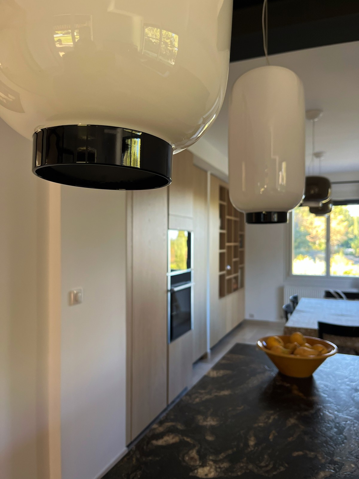 L’espace d’origine, conçu en couloir, nécessitait une réflexion spatiale rigoureuse. Il fallait optimiser la circulation, améliorer l’ergonomie et structurer l’ensemble sans sacrifier l'esthétique. L’enjeu était également d’éviter l’effet d’une simple cuisine, en créant un lieu de vie chaleureux. C’est pourquoi nous avons intégré une grande bibliothèque en chêne, véritable transition entre cuisine et salon, et pensé une grande table de repas familiale pour recevoir et partager des moments conviviaux.