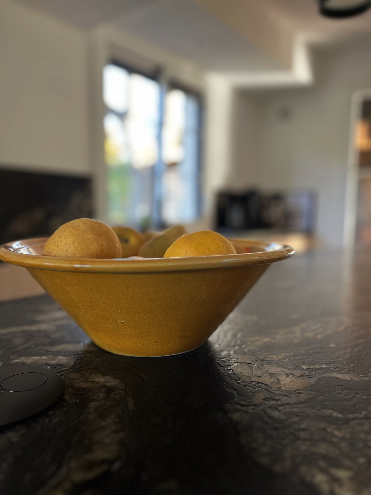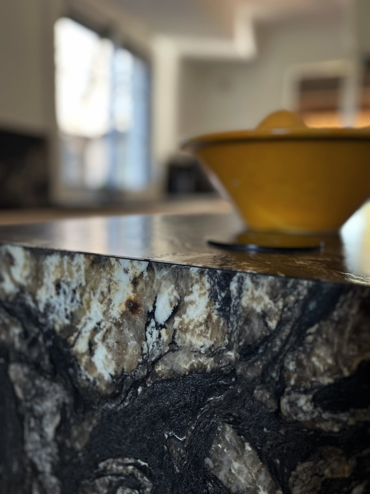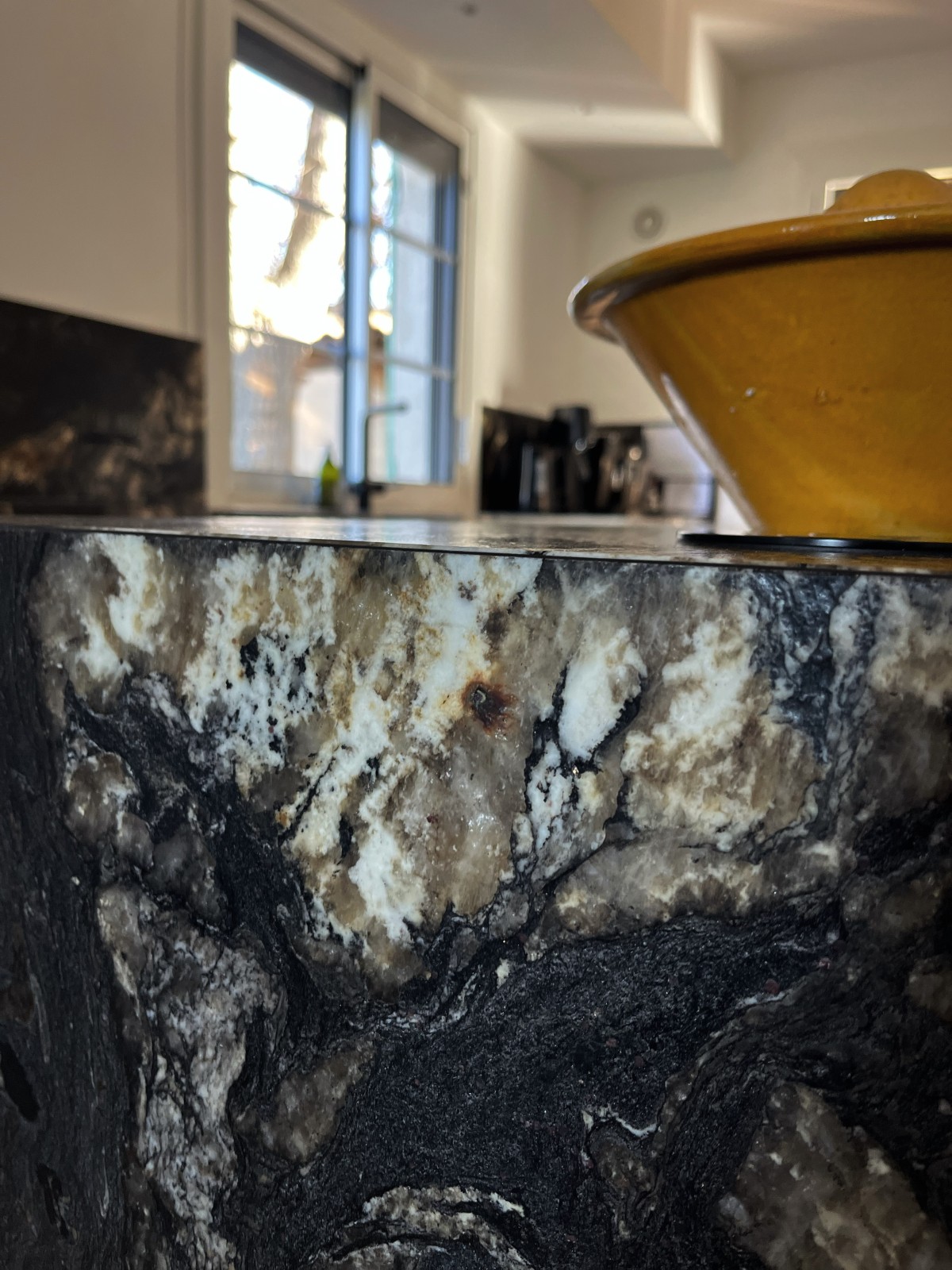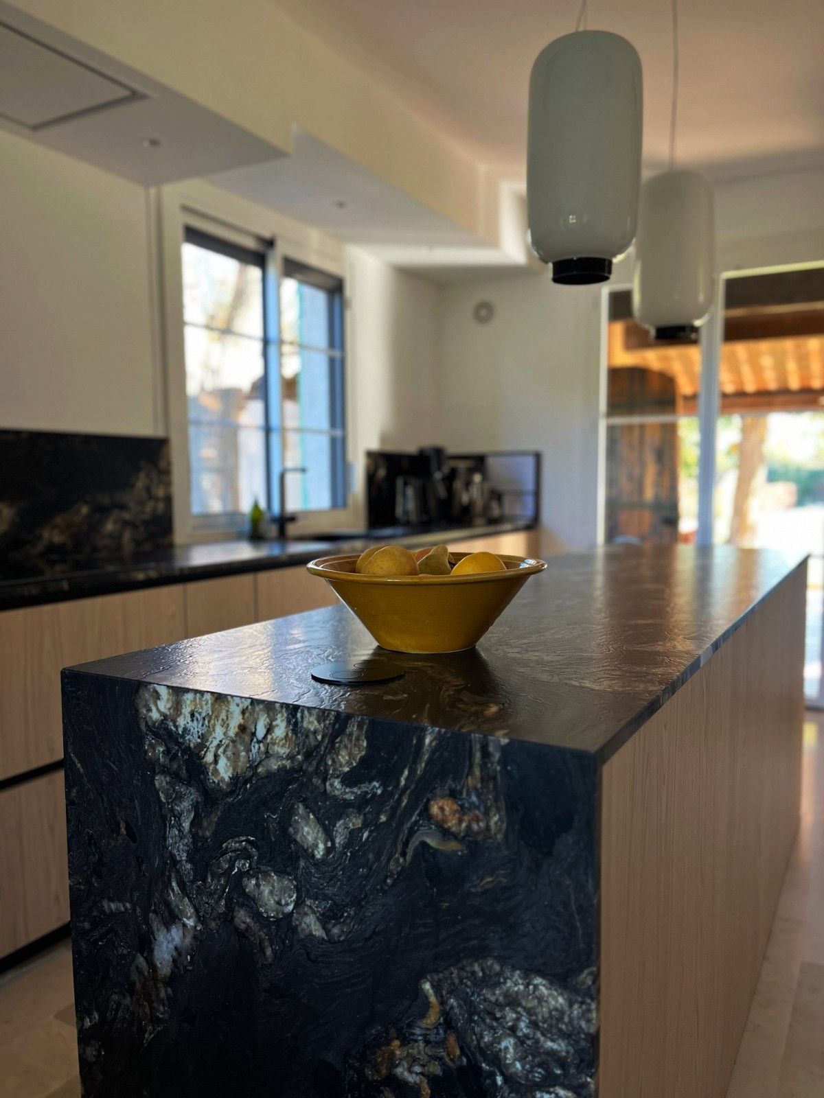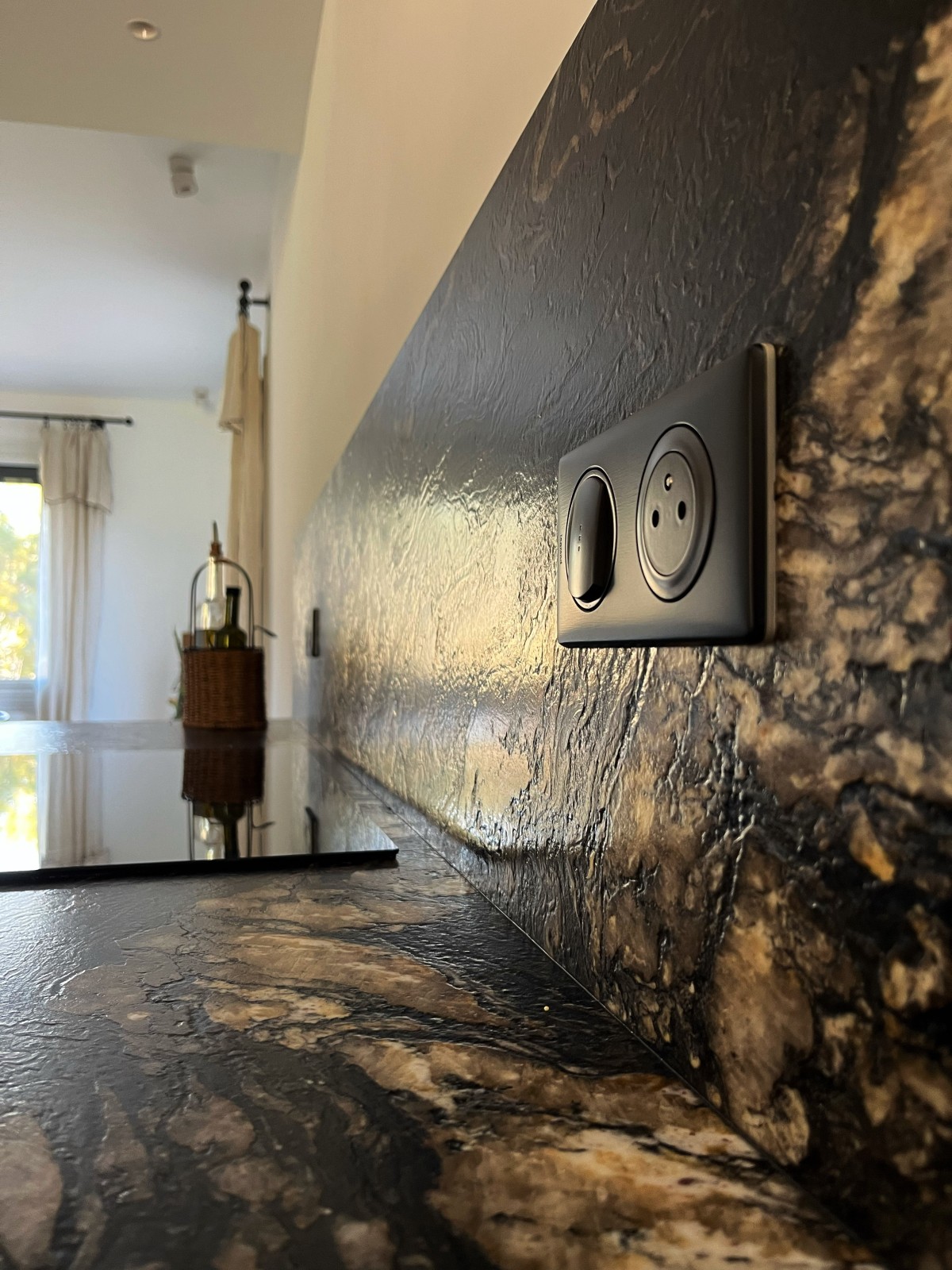 La cuisine a été entièrement repensée et reconstruite autour de matériaux nobles et durables. Le choix du granit Fusion pour le plan de travail s’est imposé comme une évidence : une pierre exceptionnelle, aux reflets cuir, avec des veinages bruns qui apportent profondeur, élégance et unicité. Ce matériau devient la pièce maîtresse de la rénovation.