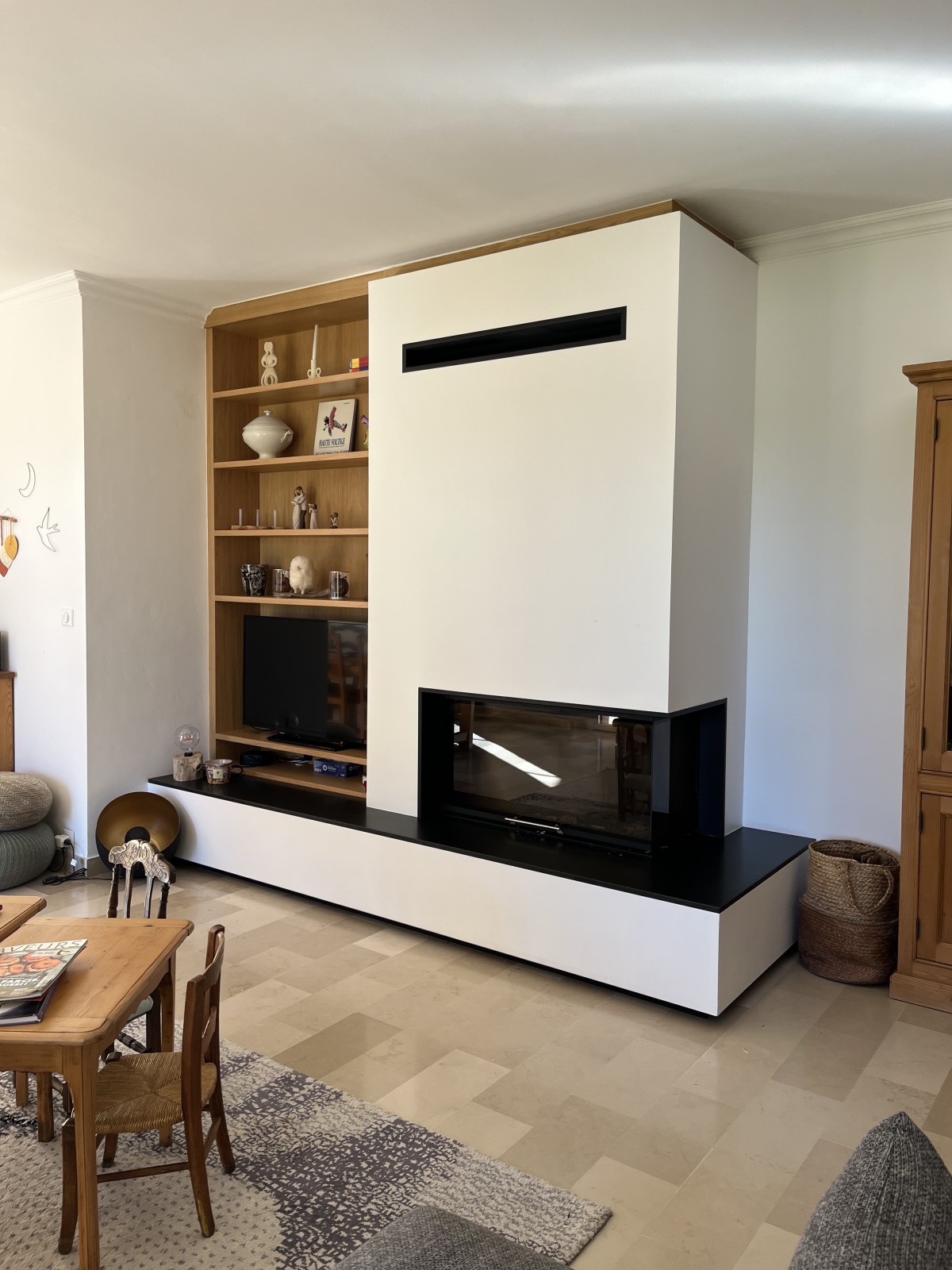 Pour maintenir l’harmonie avec le salon existant, nous avons choisi des meubles clairs en chêne naturel, en écho à la nouvelle bibliothèque sur mesure installée près de la cheminée. La cheminée contemporaine apporte une touche chaleureuse et élégante, créant un équilibre entre modernité et authenticité.