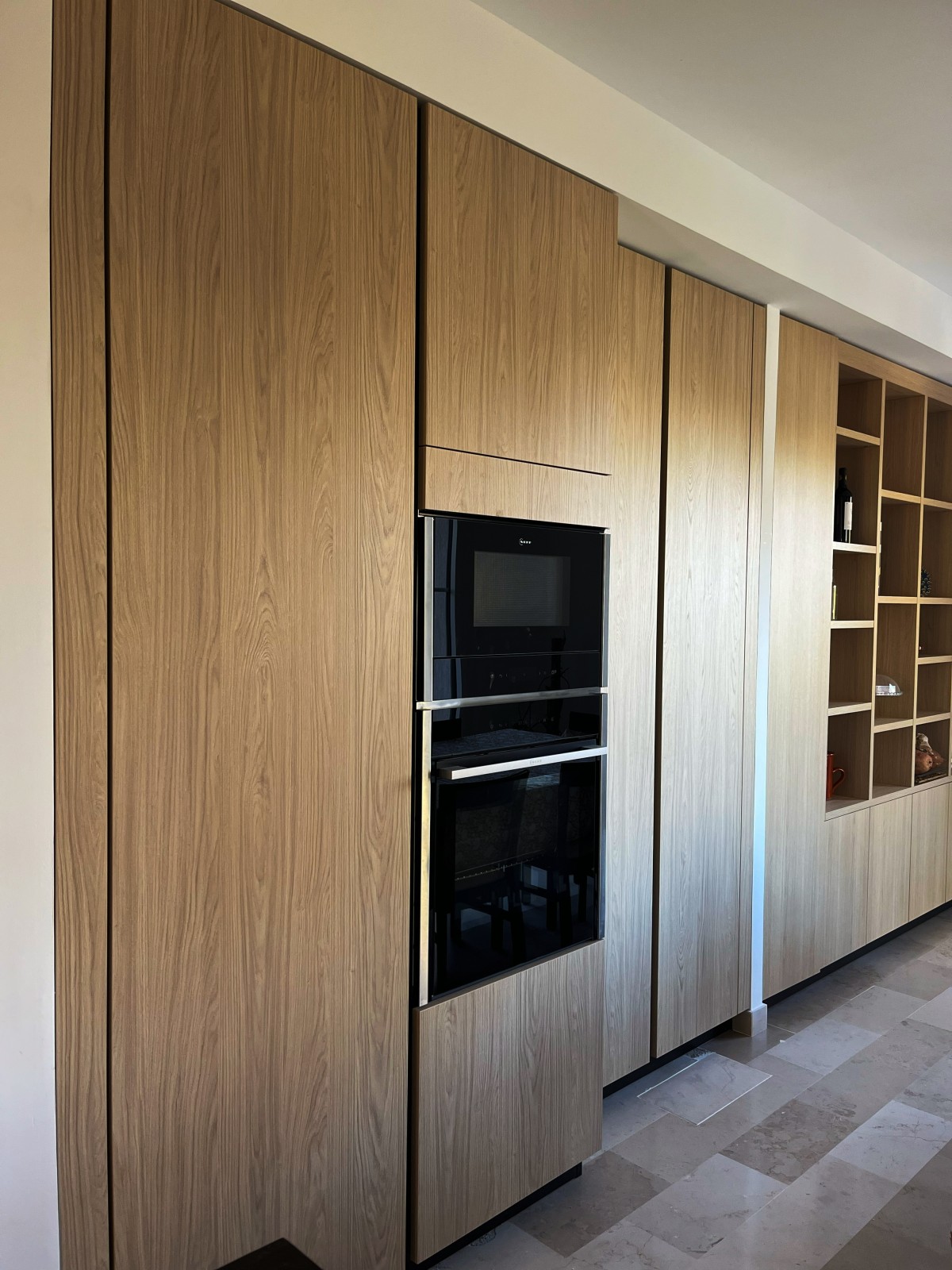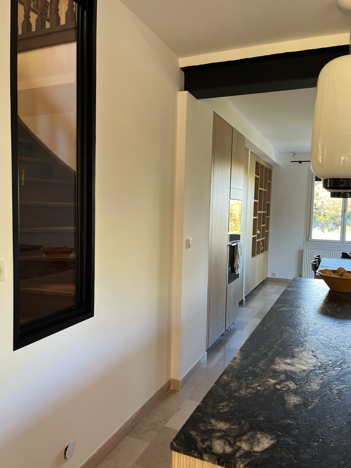 La pièce est sublimée par une grande fenêtre en chêne clair, créée spécialement pour ouvrir l’espace vers l’extérieur et renforcer l’apport de lumière. L’ensemble est mis en valeur par un sol en pierre claire, qui agrandit visuellement la pièce et apporte une douceur minérale.