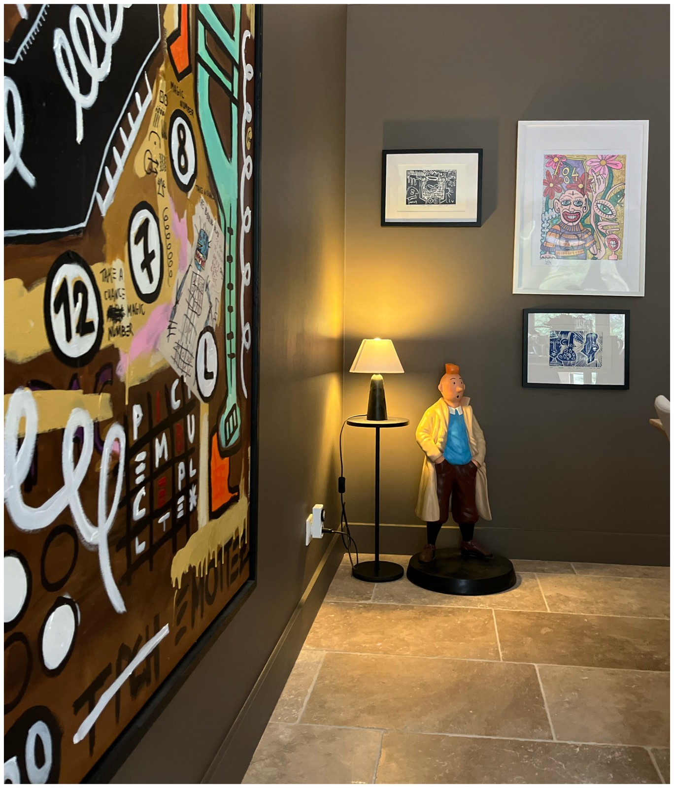 Les murs blancs mettent en valeur les œuvres des propriétaires.