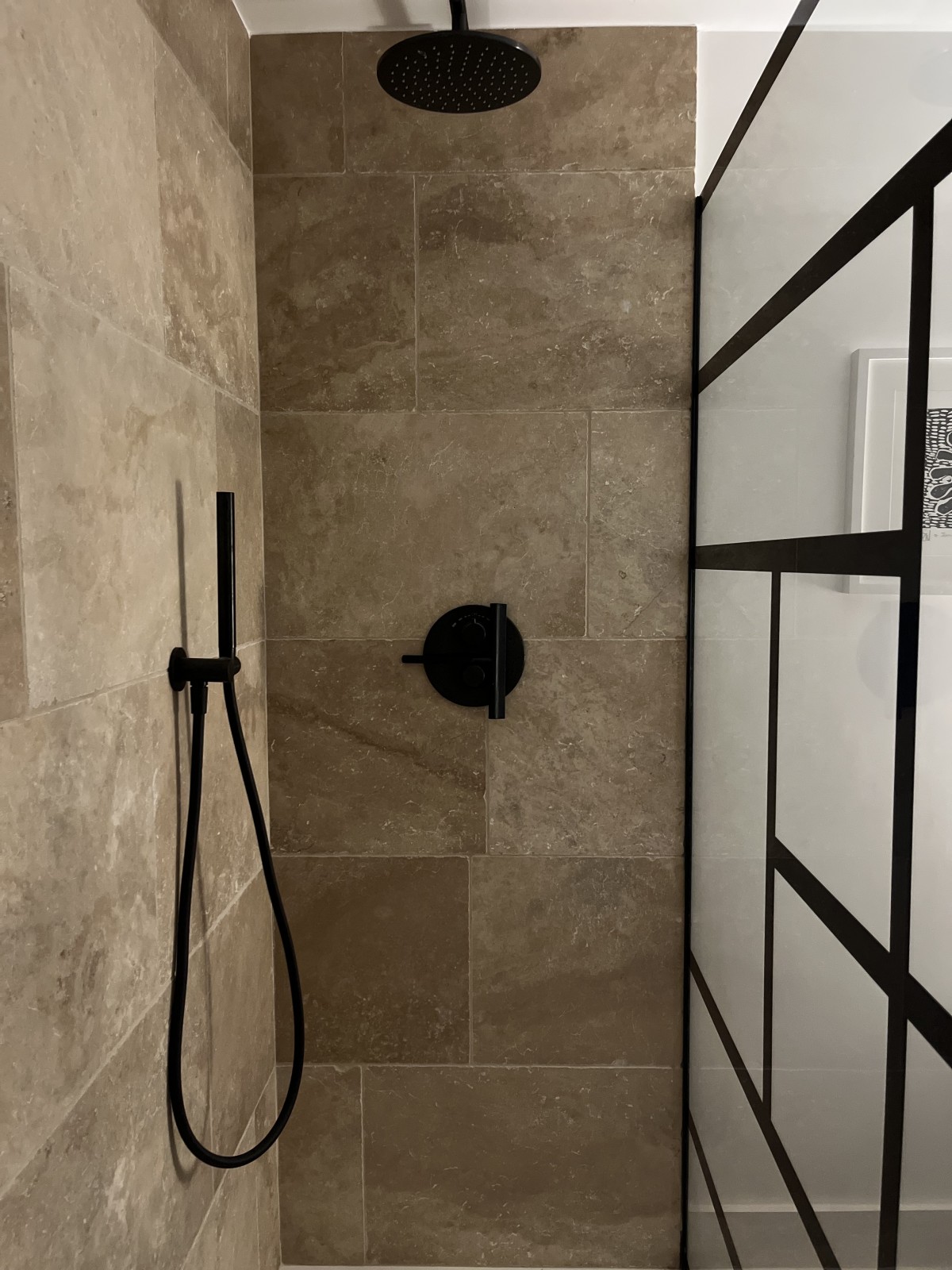 Les sols intérieurs et extérieurs ont été changé : nous avons décidé de mettre de la pierre en choisissant un très beau travertin au format rectangulaire.