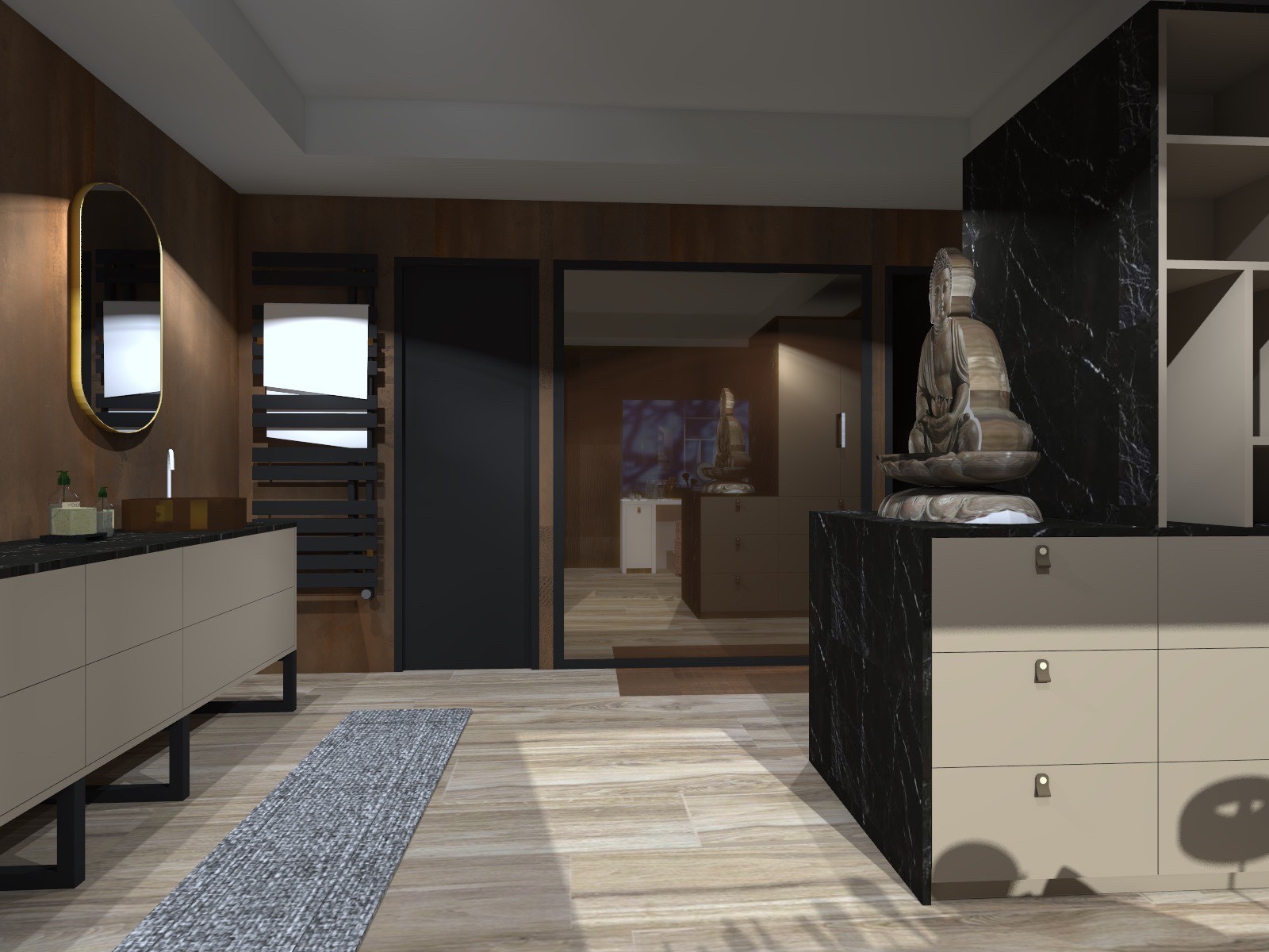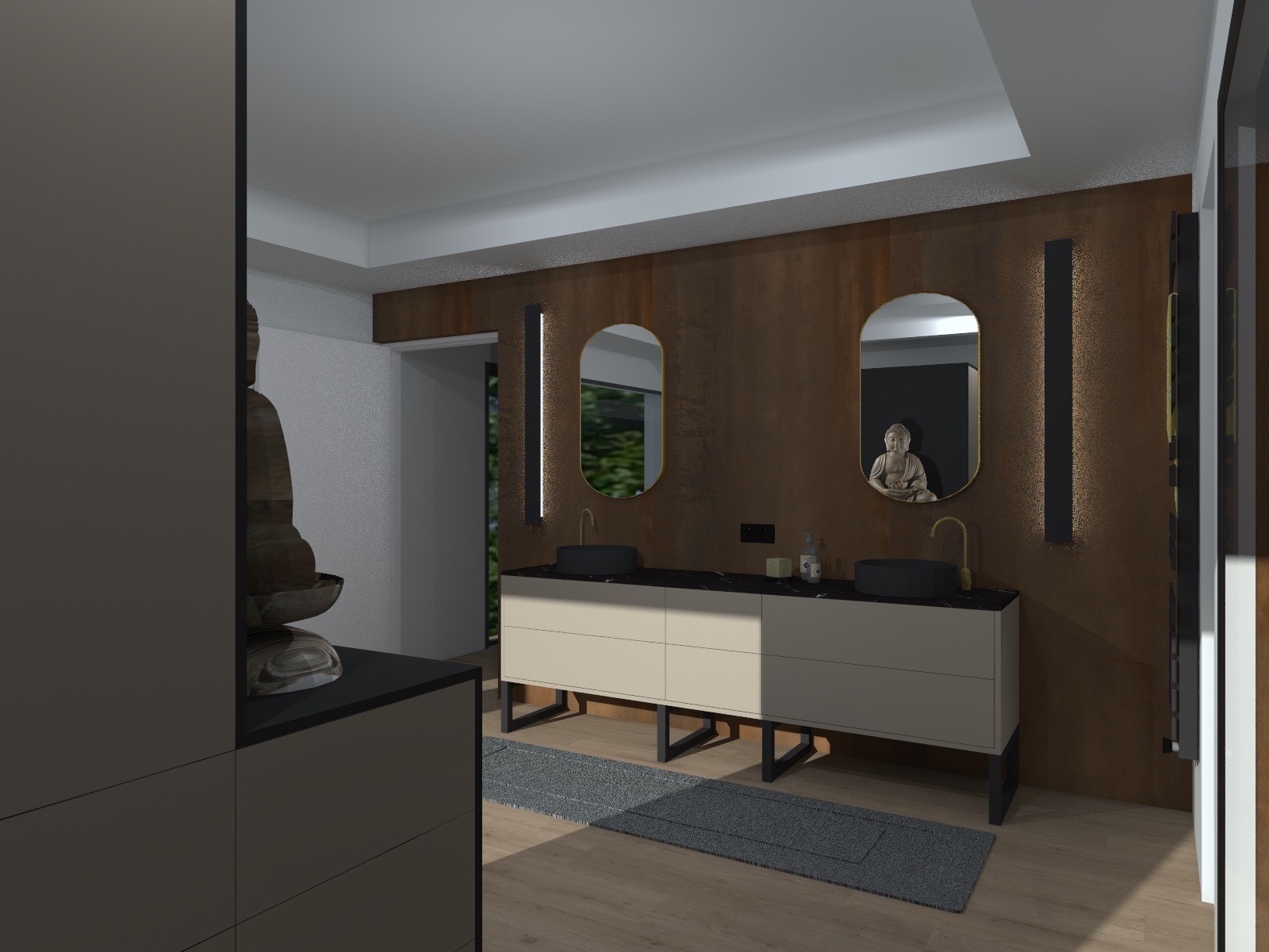 La salle de bain est composée d’un grand meuble au centre composé de différents rangements, d’une double vasque en céramique avec un espace coiffeuse tournée vers l’extérieur afin de profiter du magnifique jardin paysager par le client.