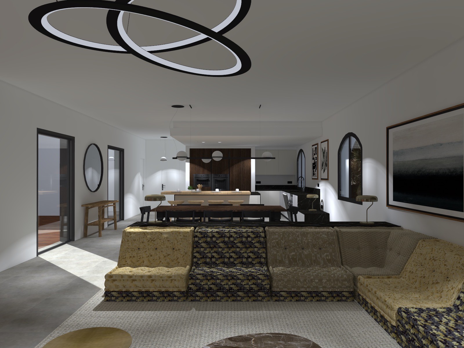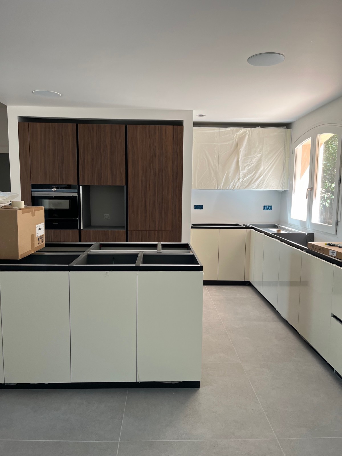 Nous avons créé une très grande cuisine ouverte composée de couleurs élégantes : une partie en laque beige , un noir très profond souligné par des portes en noyer .