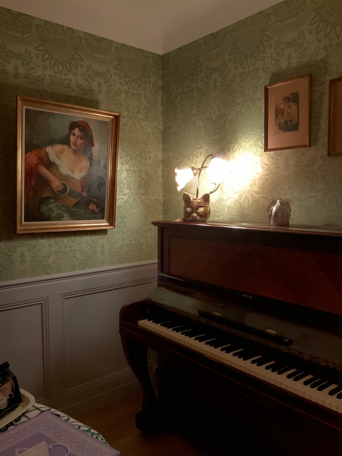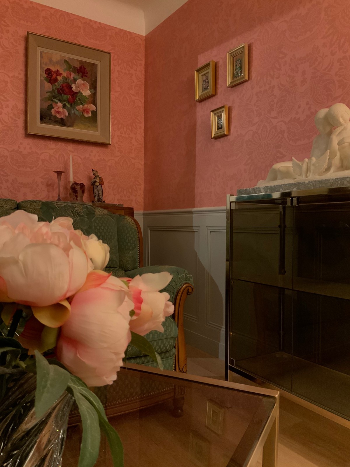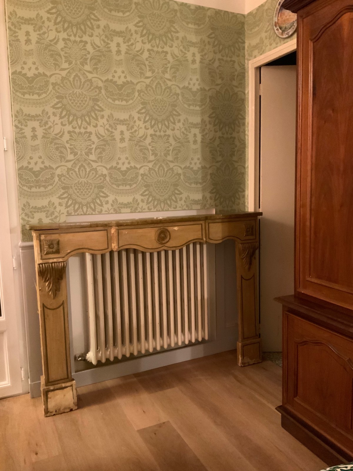 Les pièces d'antiquité ont été mises en valeur avec ces couleurs chaudes du parquet chêne doré et le papier peint aux motifs floraux tons sur tons. La cliente voulait que l'on travailler sur deux couleurs différentes : ces couleurs préférées le vert et le rose.