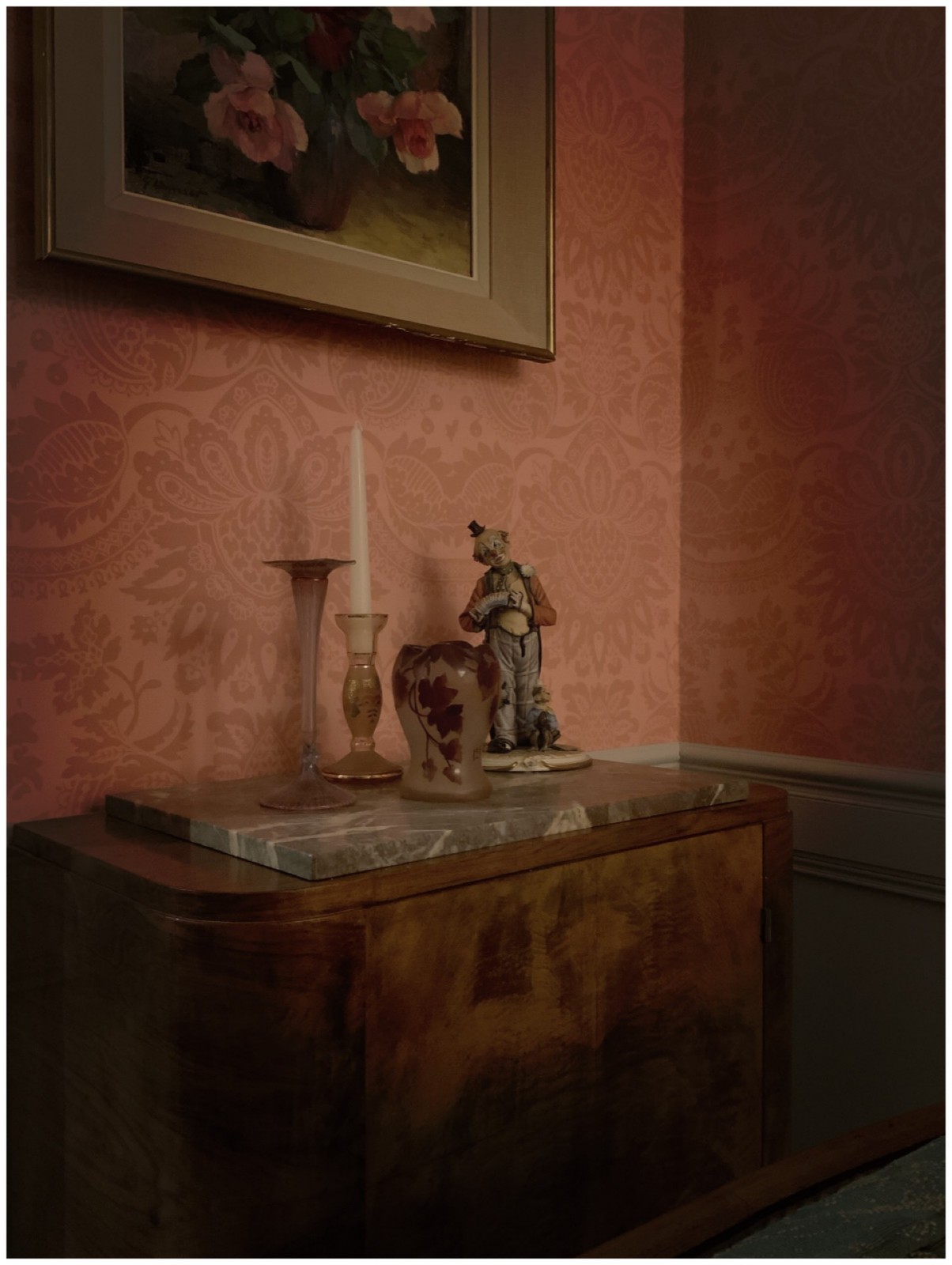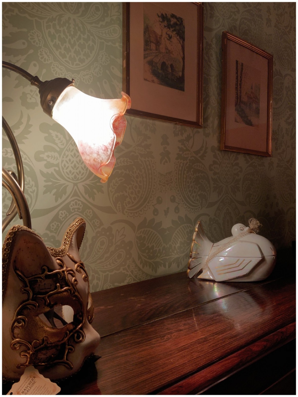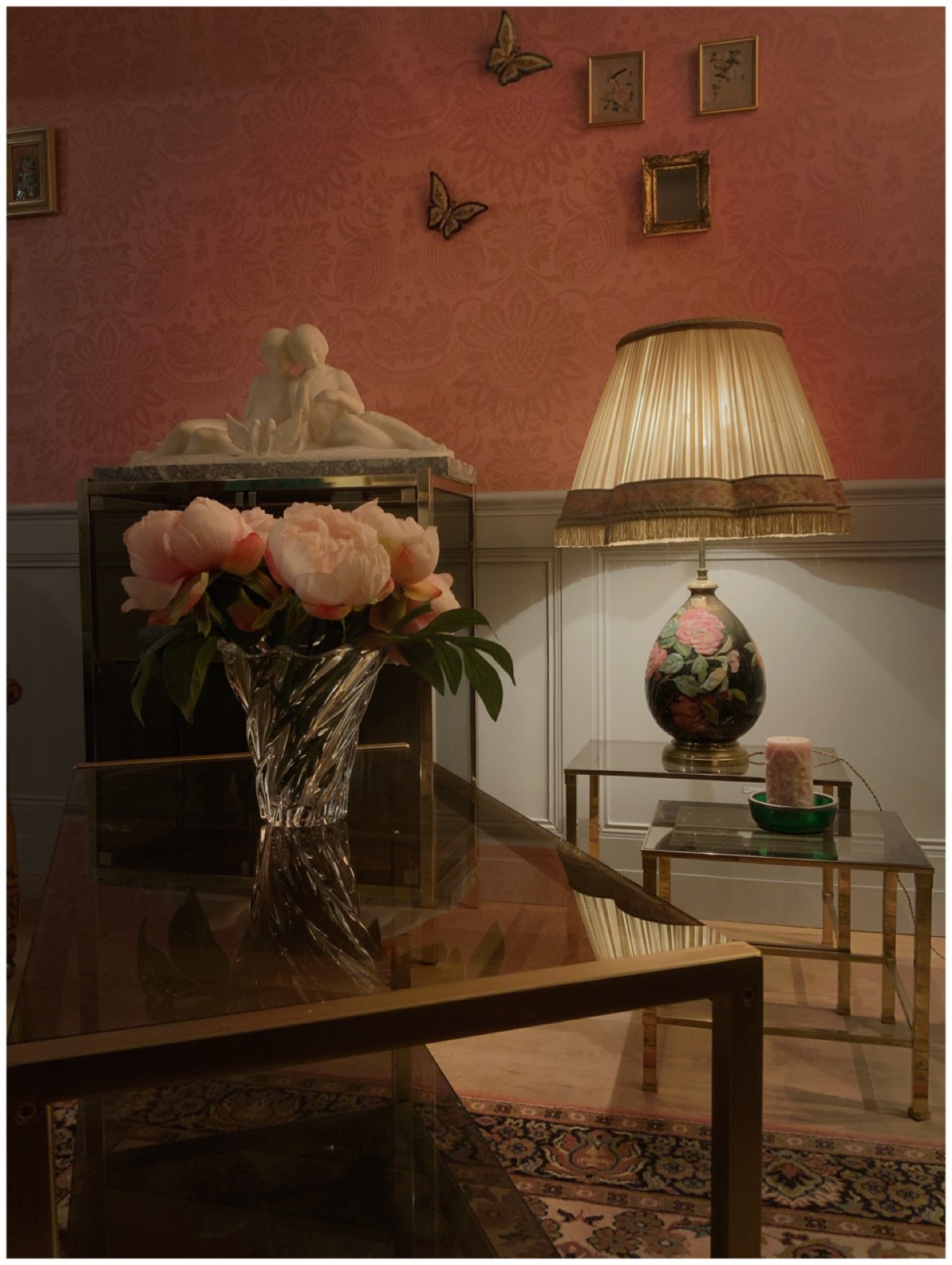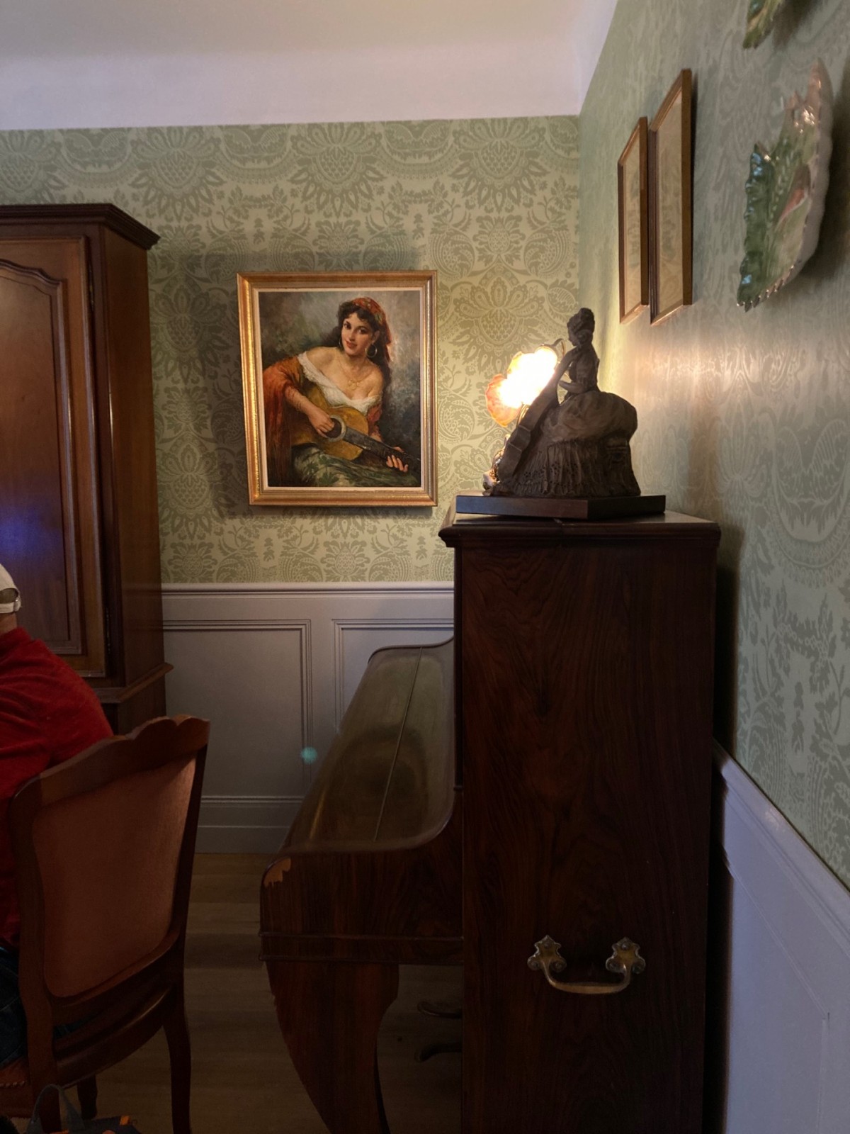 Les pièces d'antiquité ont été mises en valeur avec ces couleurs chaudes du parquet chêne doré et le papier peint aux motifs floraux tons sur tons. La cliente voulait que l'on travailler sur deux couleurs différentes : ces couleurs préférées le vert et le rose.