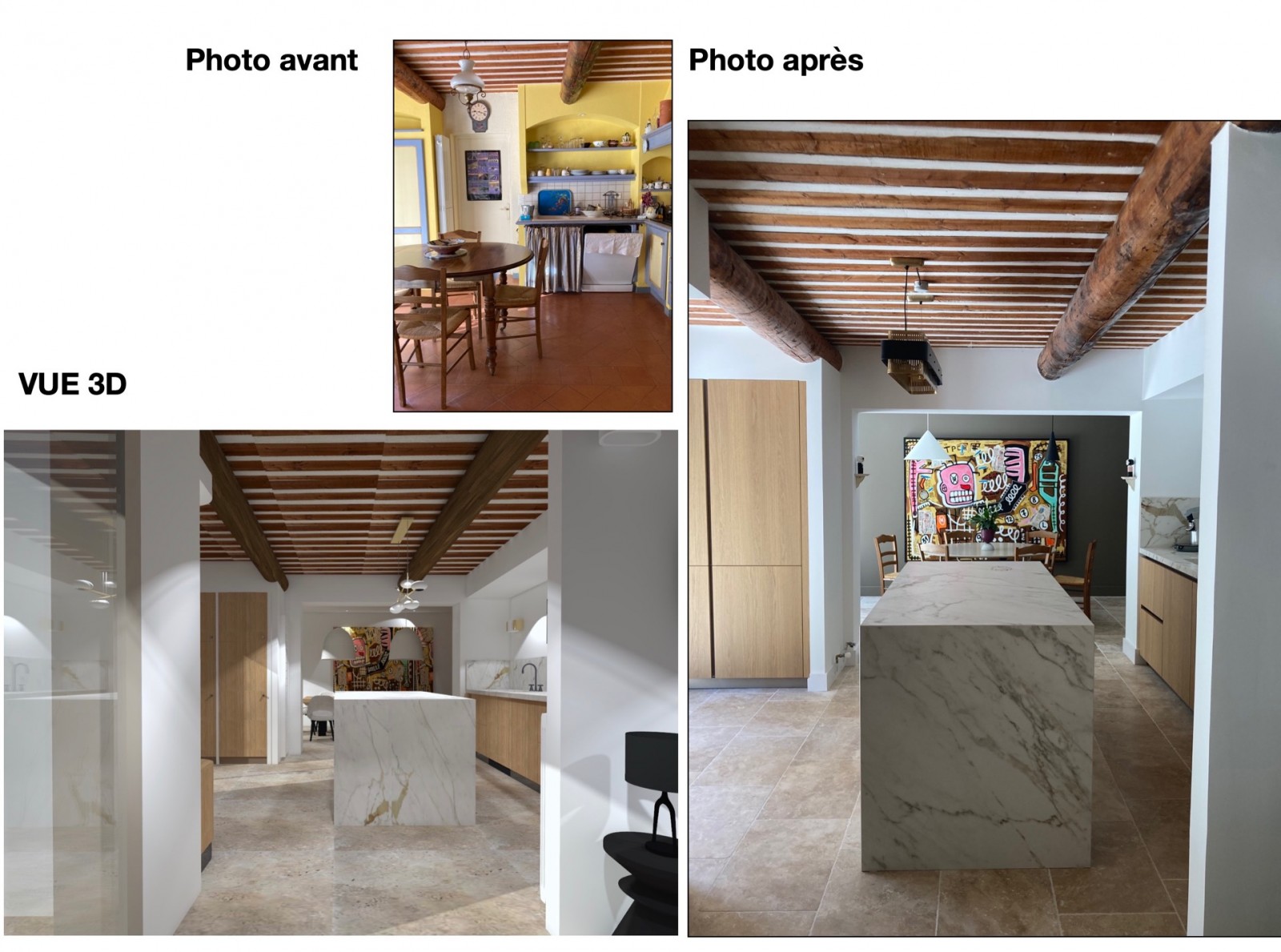 Je vous propose d’observer quelques un de nos projets que nous venons de livrer où vous pouvez distinguer les 3 étapes du travail : l’état des lieux l’avant projet, les projections en 3D et le résultat final des travaux .