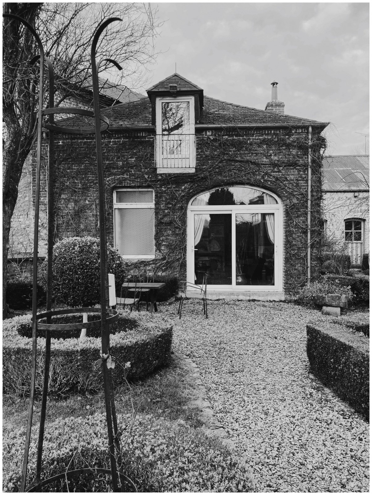 Buis, art topiaire : lignes géométriques et courbes telles le plan du tableau . Un espace et lieu tellement créatif : la maison et l’atelier d’artiste de mon père.