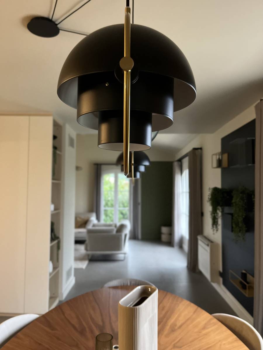 Les luminaires, souvent négligés, ont été choisis avec soin pour ajouter une touche d'originalité et d'audace à l'ensemble.